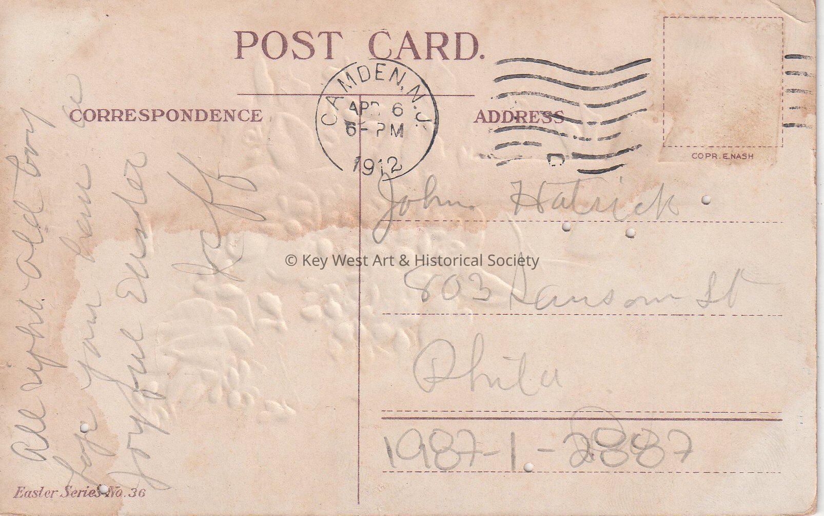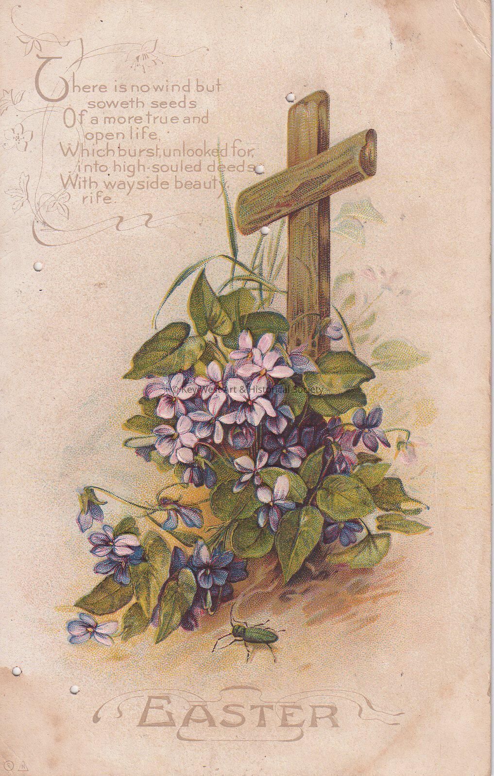 Postcard depicting a cross, violets, and an insect. The caption reads, ‘Easter. There is no wind but soweth seeds, of a more true and open life, which burst unlooked for, into high-souled deeds, with wayside beauty rife.’ The message on the verso reads, ‘All right old boy, hope you have a Joyful Easter. Jeff’. The card is addressed to Mr. John Hattrick, 803 Samson Street, Philadelphia, Pennsylvania, and is postmarked Camden, New Jersey, April 6, 1912.Collection