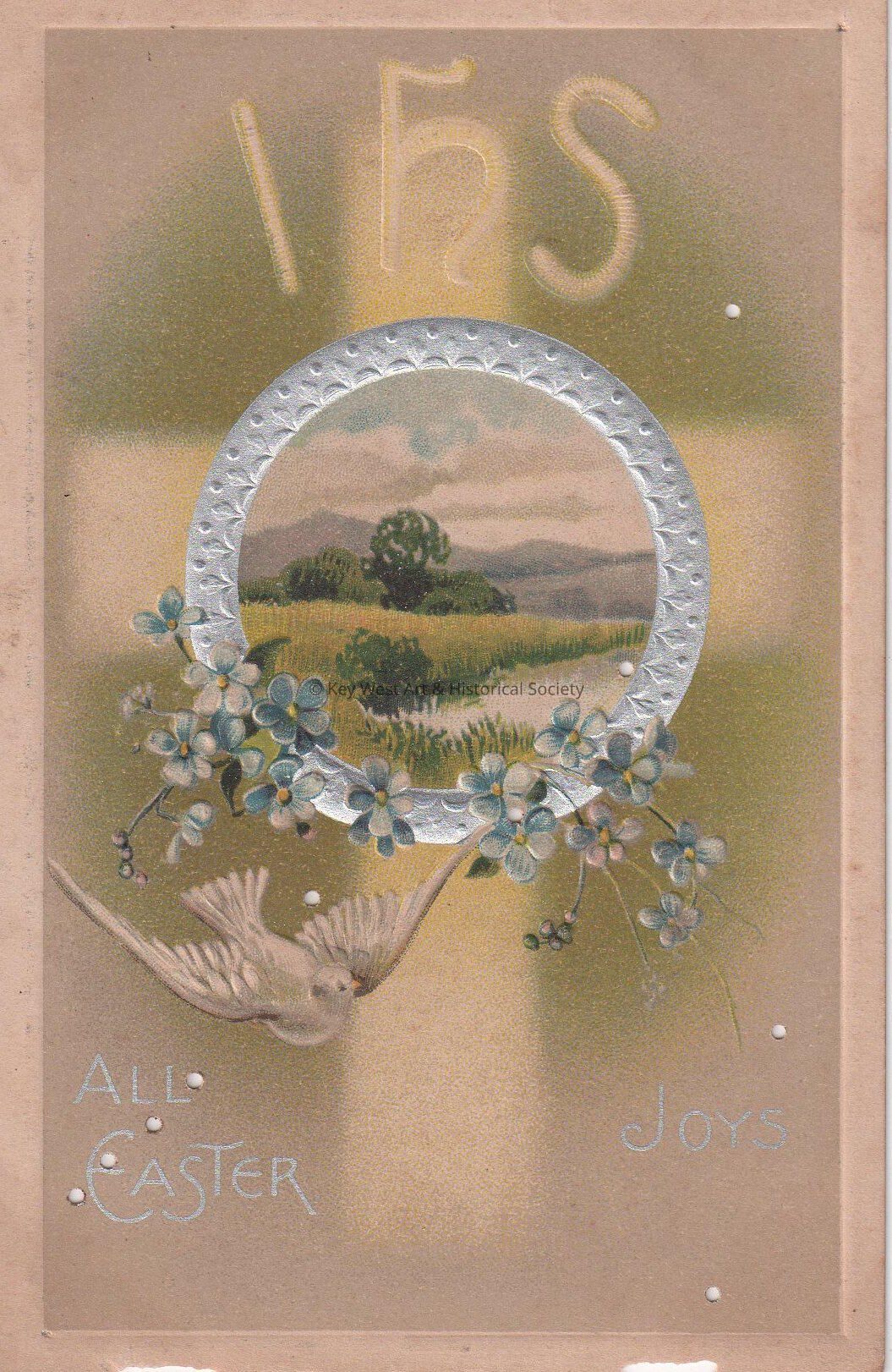 Postcard depicting a dove, cross, and flowers near a pastoral painting. The caption reads, ‘IHS. All Easter Joys’. The message on the verso reads, 'From Alice'. The card is addressed to Aunt Carrie Hattrick.Collection