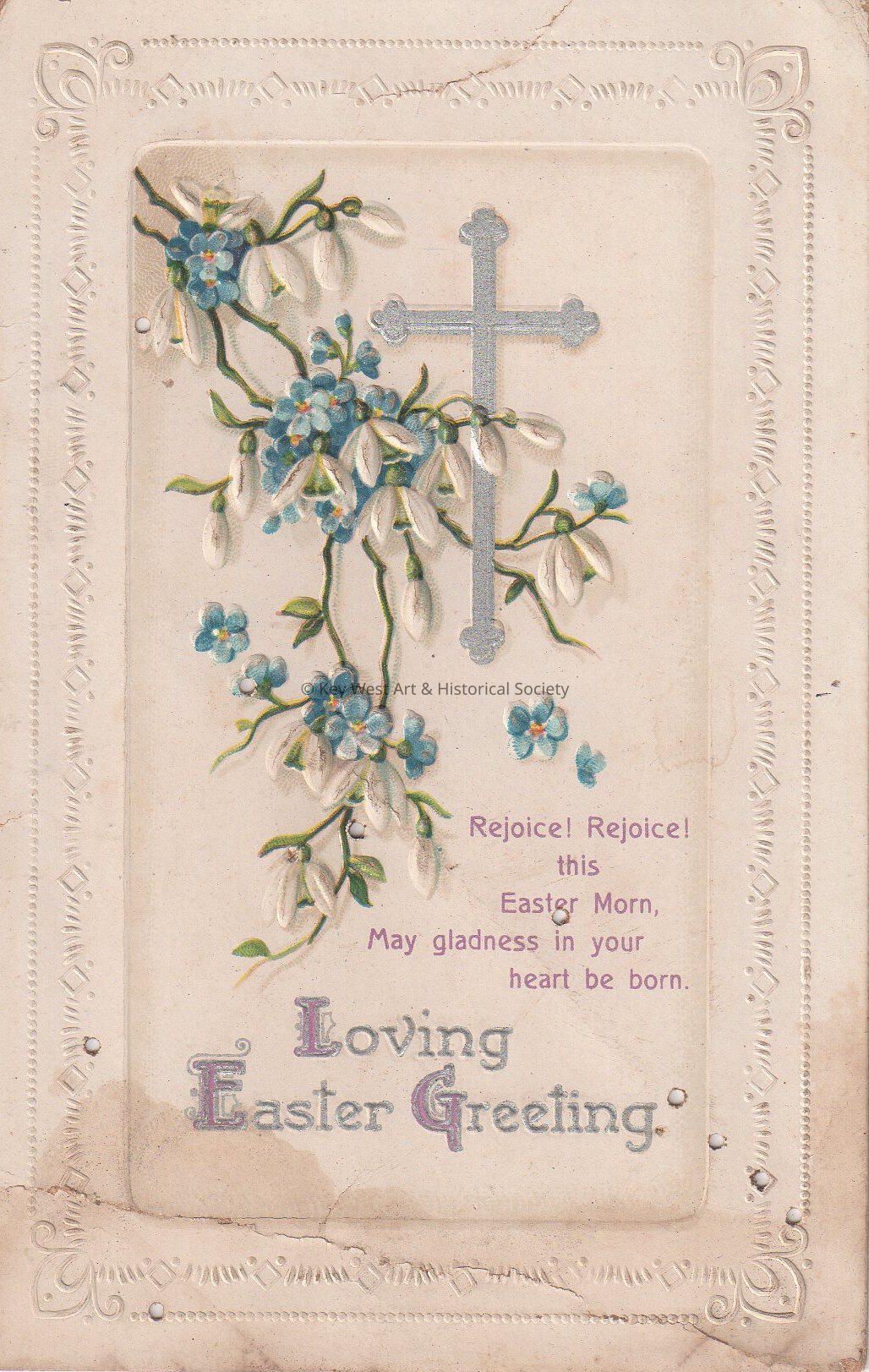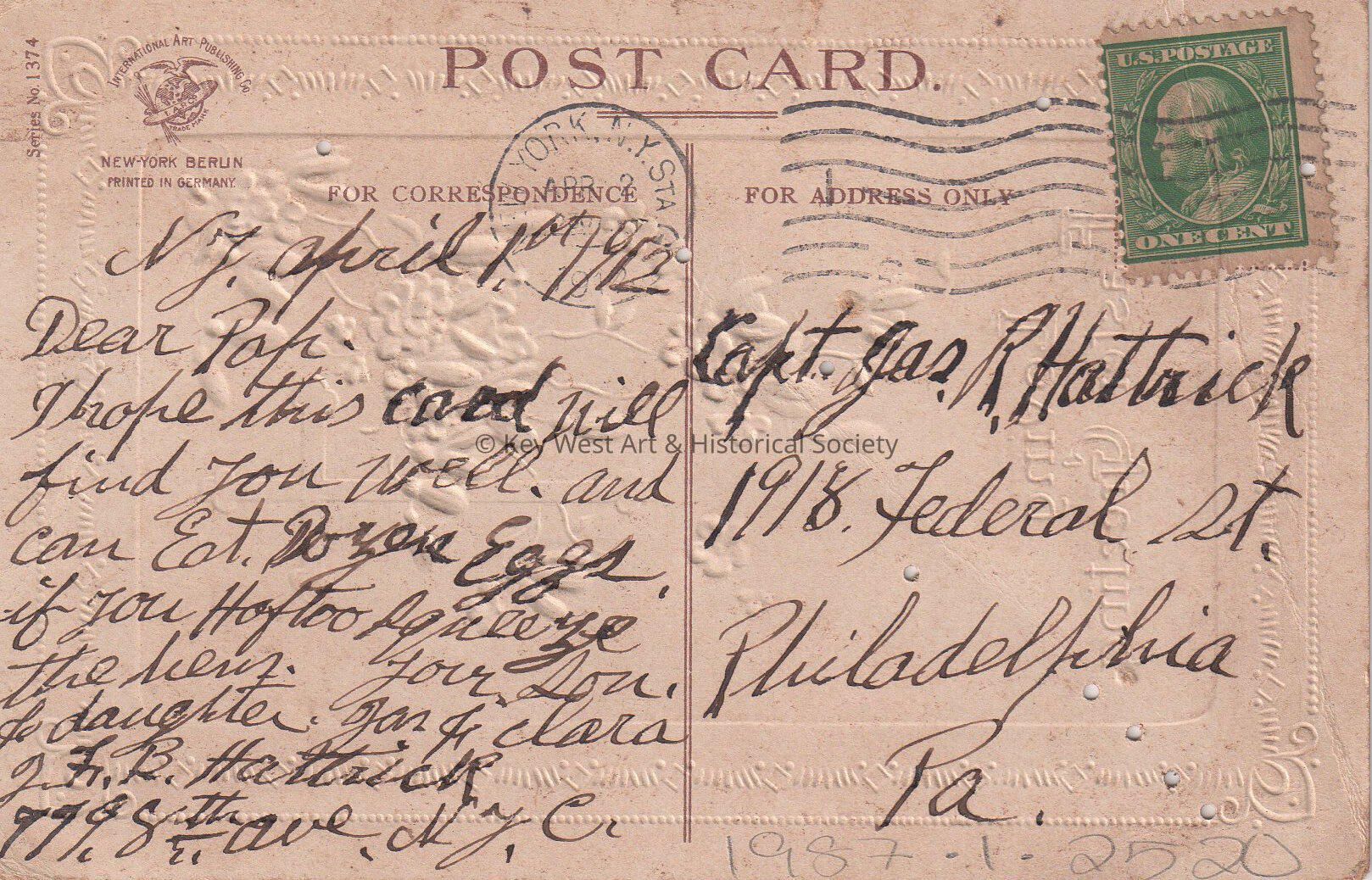 Postcard depicting flowers and a cross. The caption reads, ‘Loving Easter Greeting. Rejoice! Rejoice! This Easter morn, may gladness in your heart be born.’ The message on the verso reads, ‘New York, April 1st, 1912, Dear Papa, I hope this card will find you well and can eat dozen eggs. If you have too squeeze the hens. Your Son & daughter, James & Clara J.F.B. Hattrick, 779 8th Avenue, New York City.’ The card is addressed to Captain James R. Hattrick, 1918 Federal Street, Philadelphia, Pennsylvania, and is postmarked, New York, New York, April 2, 1912.Collection