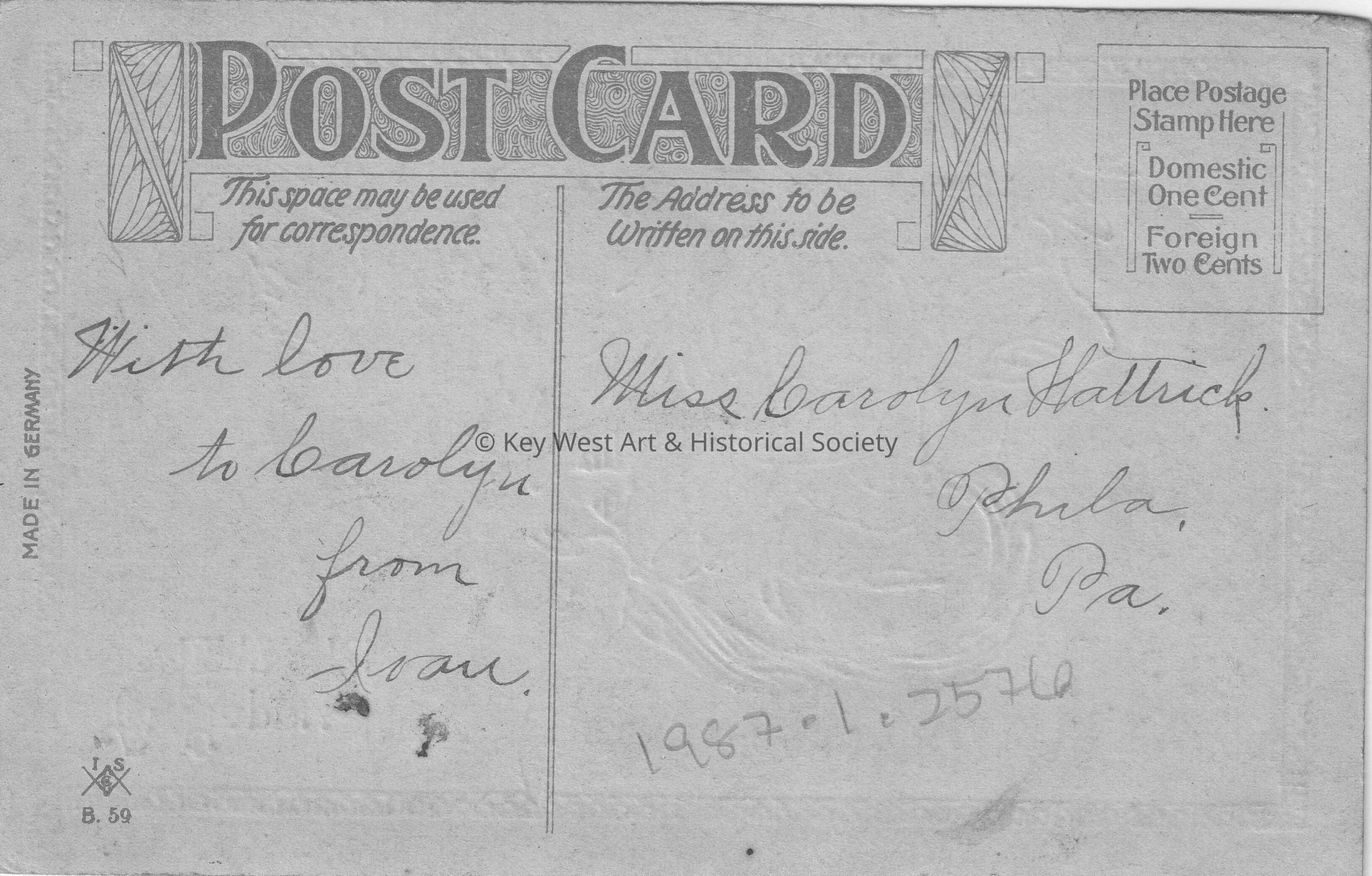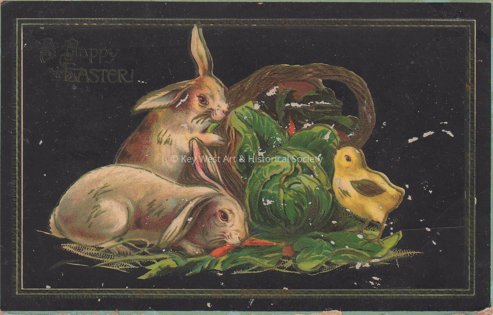 Postcard depicting rabbits, lettuce, and a chick. The caption reads, ‘Happy Easter’. The message on the verso reads, ‘With love to Carolyn, from Ivan’. The card is addressed to Miss Carolyn Hattrick, Philadelphia, Pennsylvania.Collection