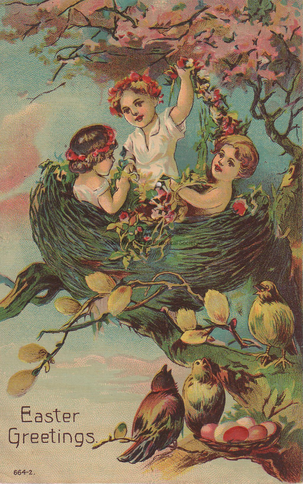 Postcard depicting birds and three girls in a bird’s nest. The caption reads, ‘Easter Greetings’.Collection