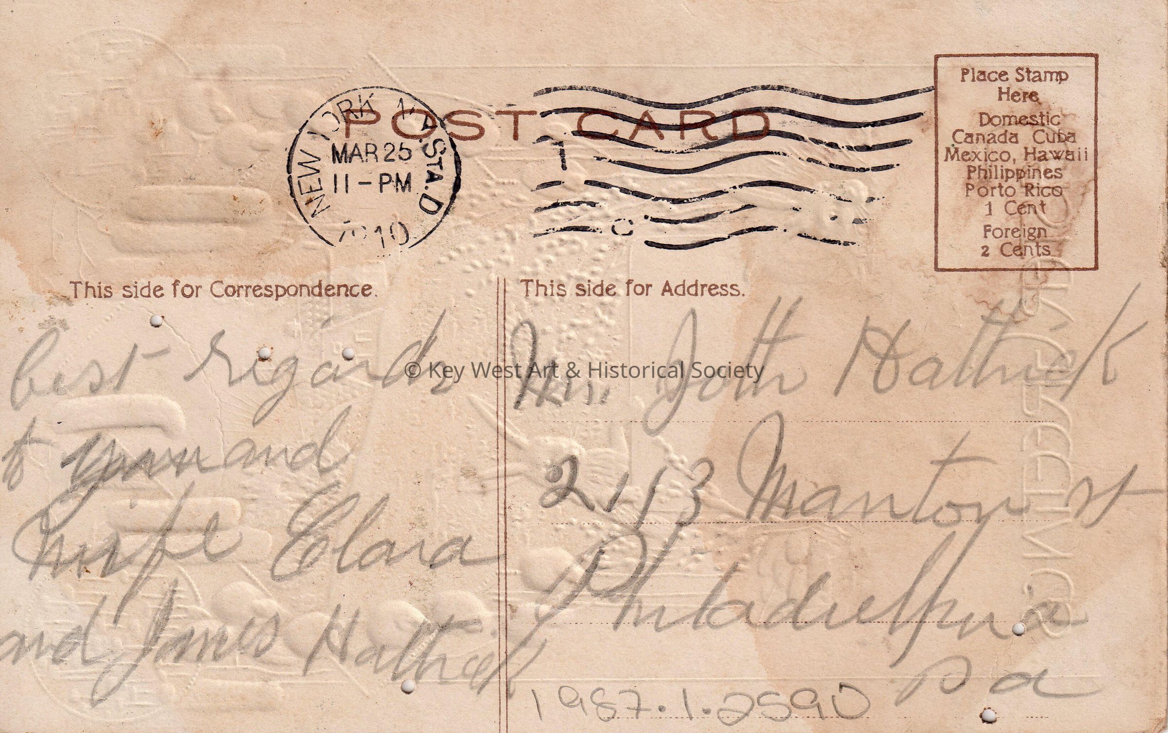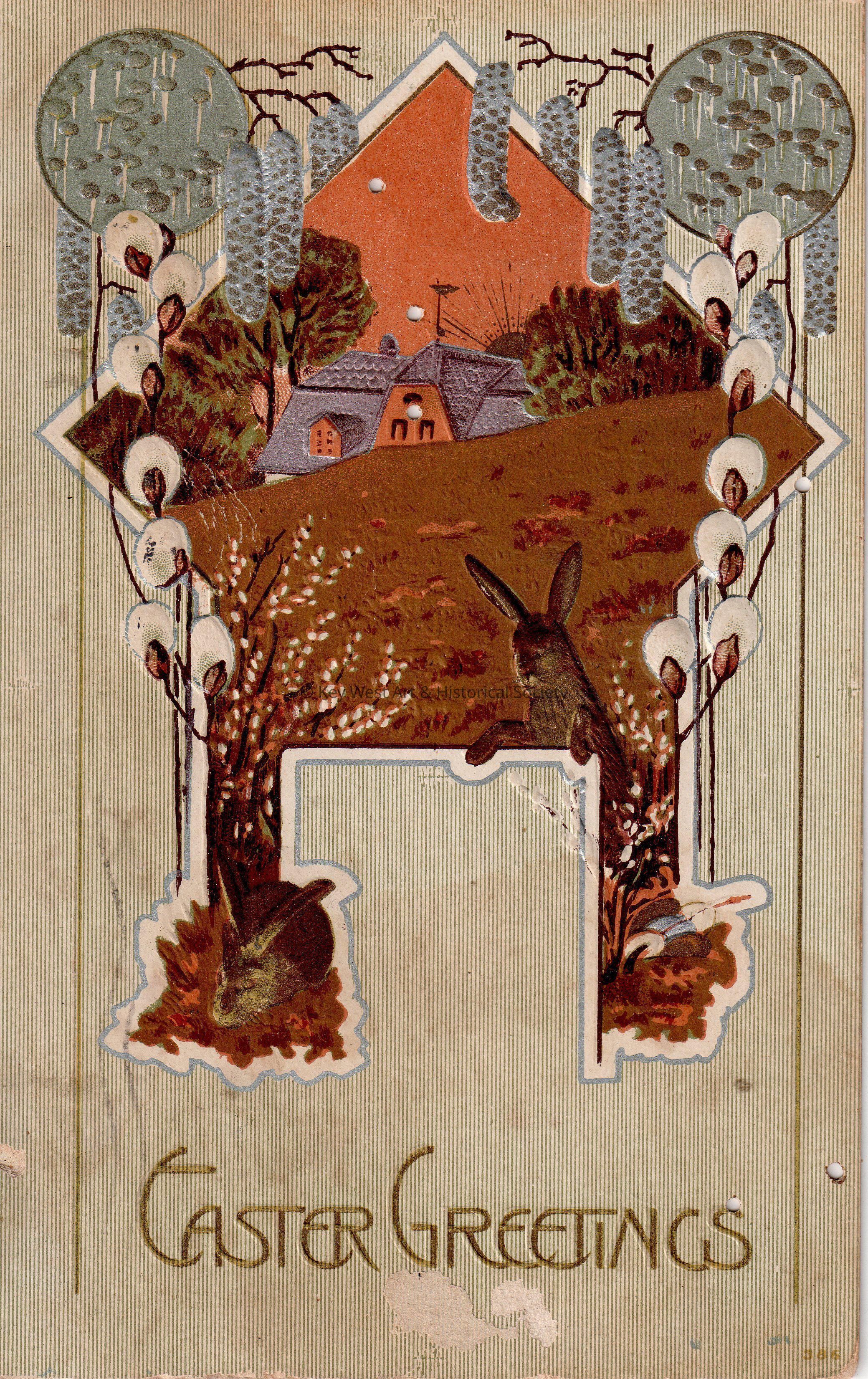 Postcard depicting rabbits near a house. The caption reads, ‘Easter Greetings’. The message on the verso reads, ‘Best regards to you and wife. Clara James Hattrick.’ The card is addressed to Mr. John Hattrick, 2113 Manton Street, Philadelphia, Pennsylvania, and is postmarked New York, New York, March 25, 1910.Collection