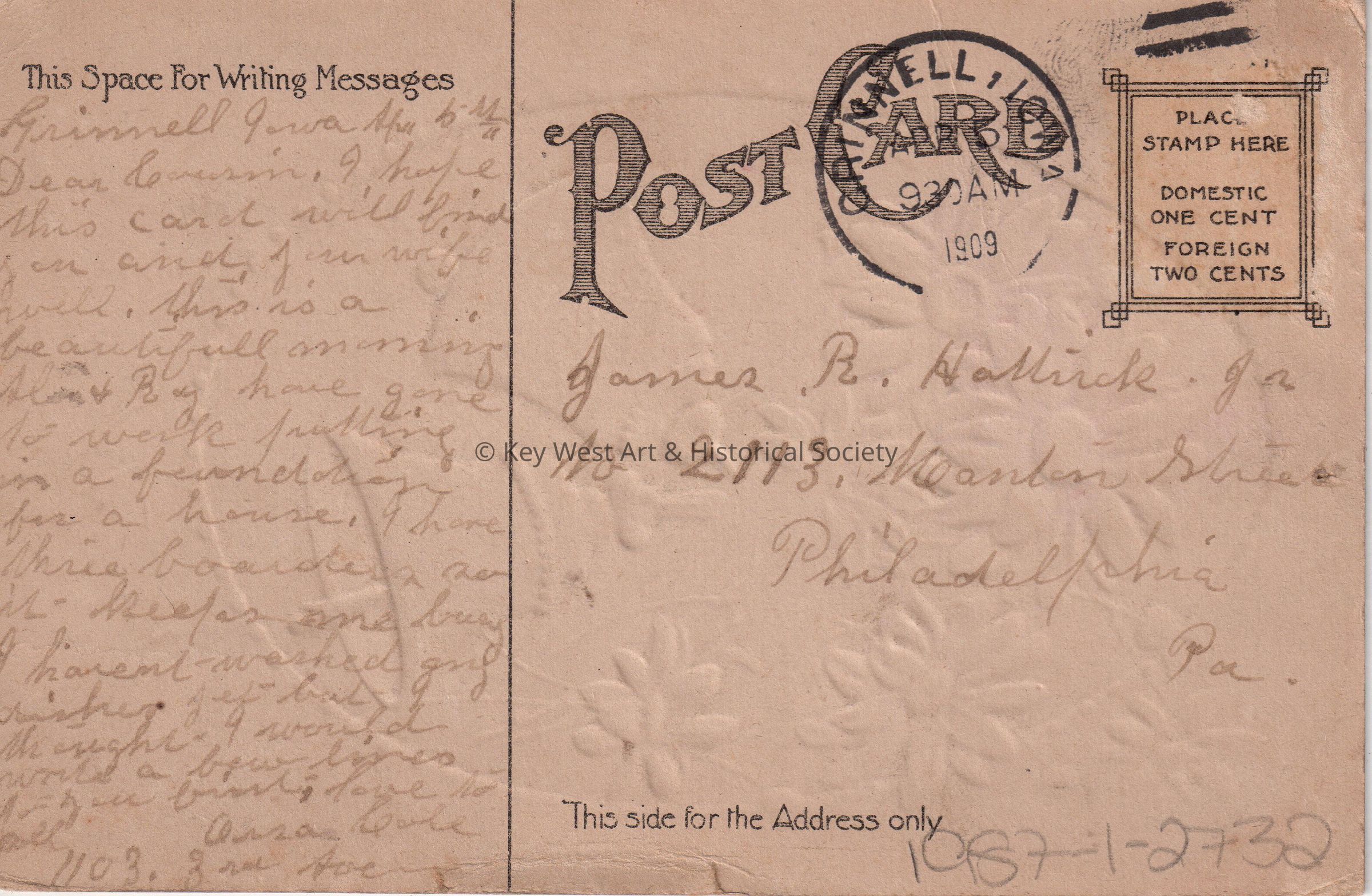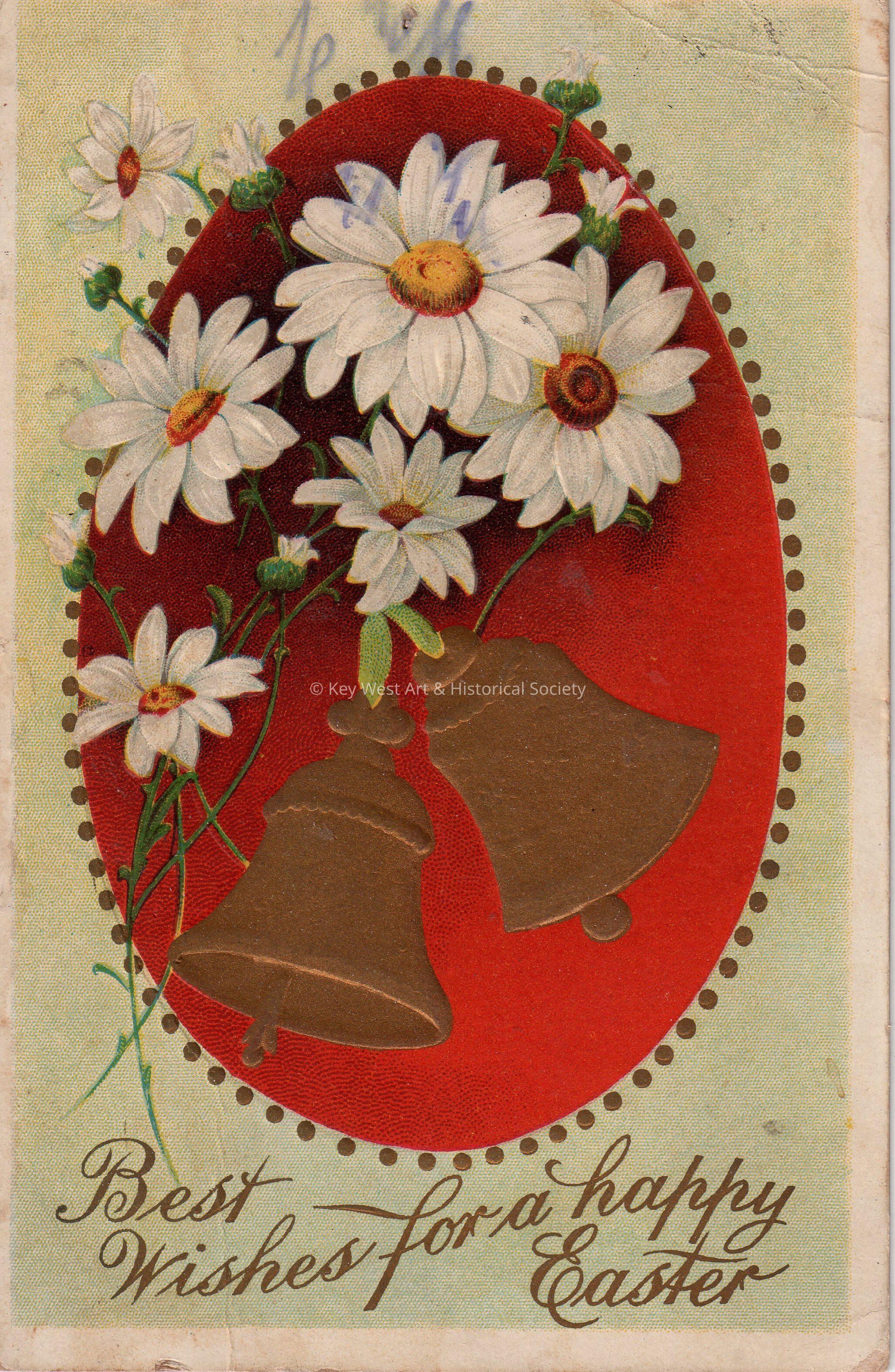 Postcard depicting daisies and bells. The caption reads, ‘Best Wishes for a happy Easter’. The message on the verso reads, ‘Grinnell, Iowa, April 5th. Dear Cousin, I hope this card will find you and your wife well. This is a beautiful morning. ___ and __ have gone to work putting in a foundation for a house. I have three boarders now – it keeps me busy. I haven’t washed my dishes yet but thought I would write a few lines to you both – love to all. Orsa Cole. 1103 3rd Avenue.’ The card is addressed to James R. Hattrick, Jr., No. 2113 Manton Street, Philadelphia, Pennsylvania, and is postmarked Grinnell, Iowa, April 5, 1909.Collection