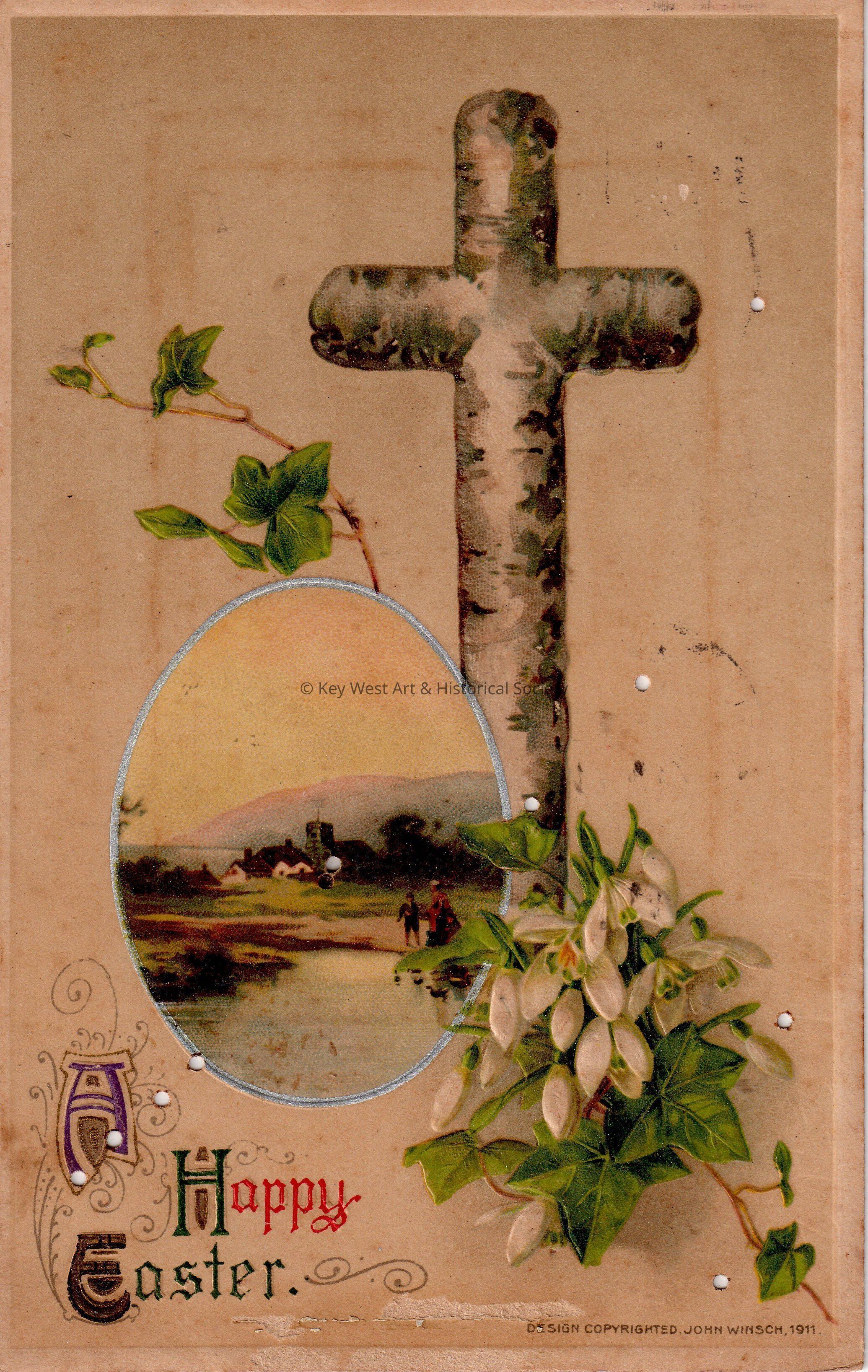 Postcard depicting flowers and a cross near a painting of a creek and a house. The caption reads, ‘A Happy Easter’. The message on the verso reads, ‘Hannah and Frank’. The card is addressed to Mr. and Mrs. John Hattrick, 2113 Manton Street, Philadelphia, and is postmarked Philadelphia, April 4, 1912.Collection