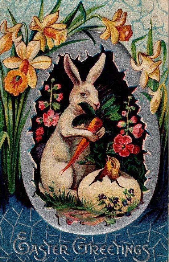 Postcard depicting daffodils surrounding an egg that contains a rabbit, carrot, chick, and another egg. The caption reads, ‘Easter Greetings’. The message on the verso reads, ‘To Dear little Carolyn with love and best wishes for a Happy Easter from Aunt Rosie.' The card is addressed to Miss Carolyn Hattrick, 2113 Manton Street, Philadelphia, Pennsylvania.Collection