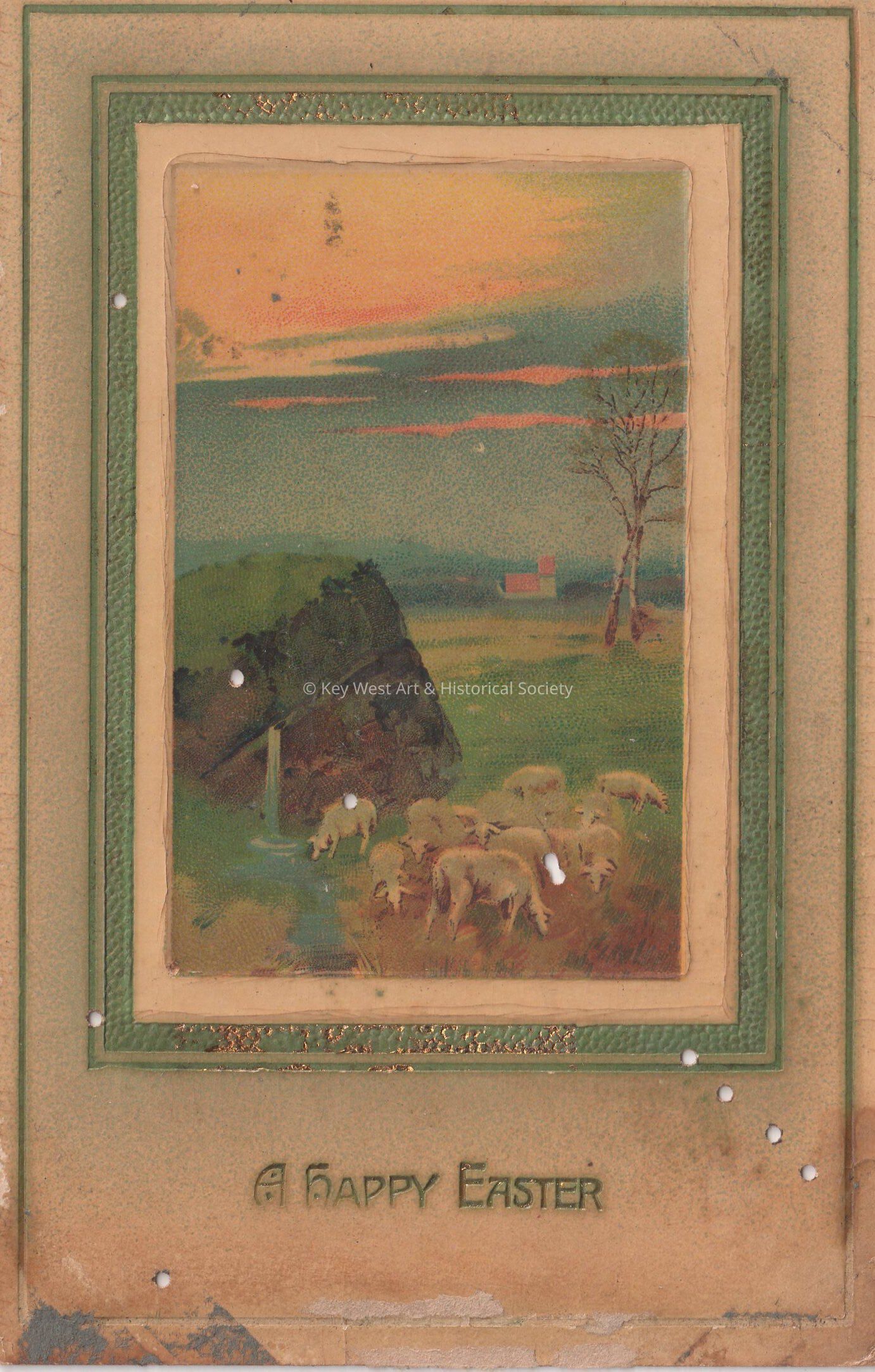 Postcard depicting a painting of sheep in a field. The caption reads, ‘A Happy Easter’. The message on the verso reads, 'Uncle Will and Aunt Hester, 1912'.Collection
