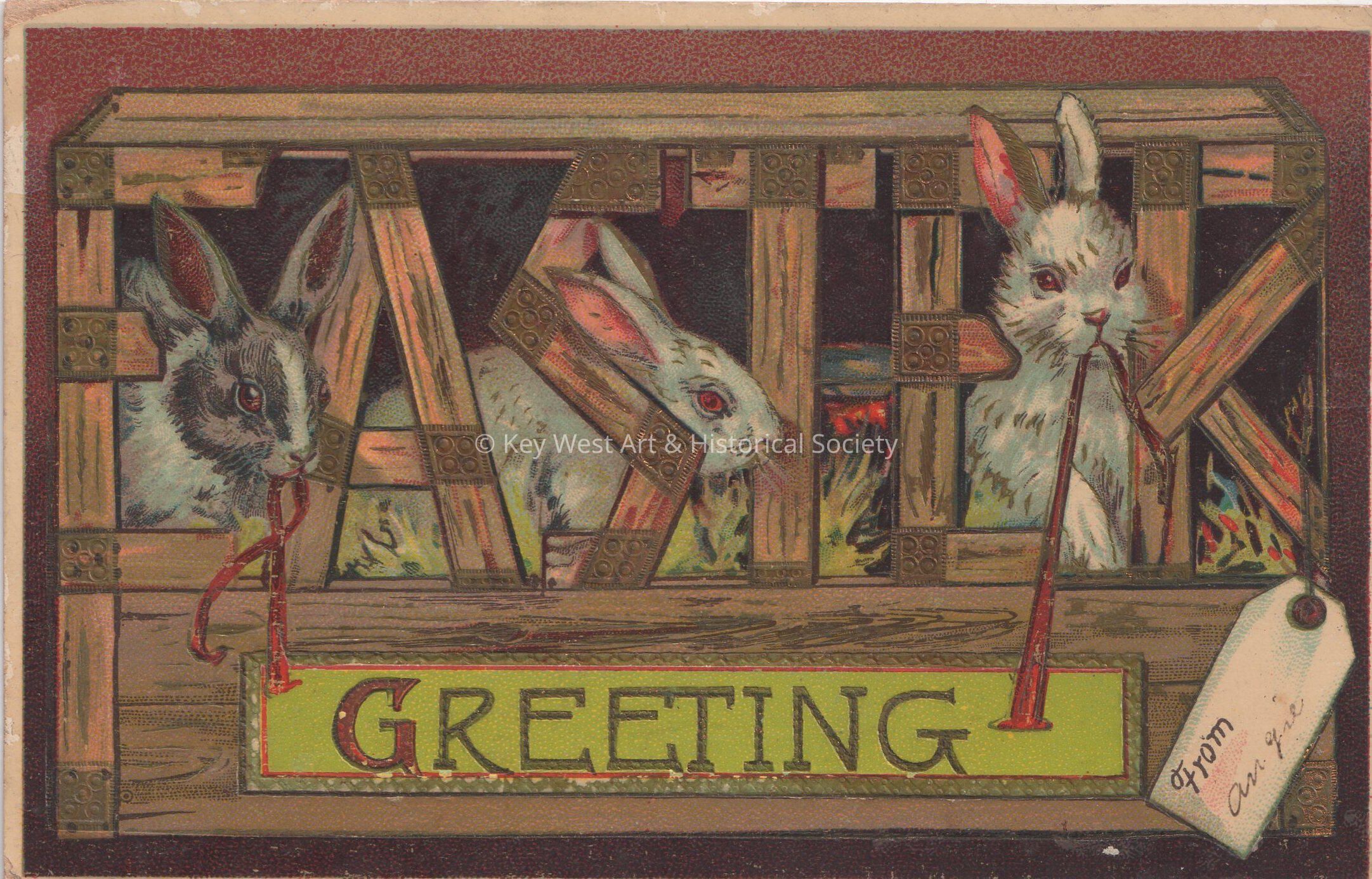 Postcard depicting rabbits in a crate. The caption reads, ‘Easter Greetings from Angie’. The message on the verso reads, ‘Dear Carolyn, I am sending you this postal hoping you will have a happy Easter. Love from All, Angie.’ The card is addressed to Carolyn from Angie.Collection