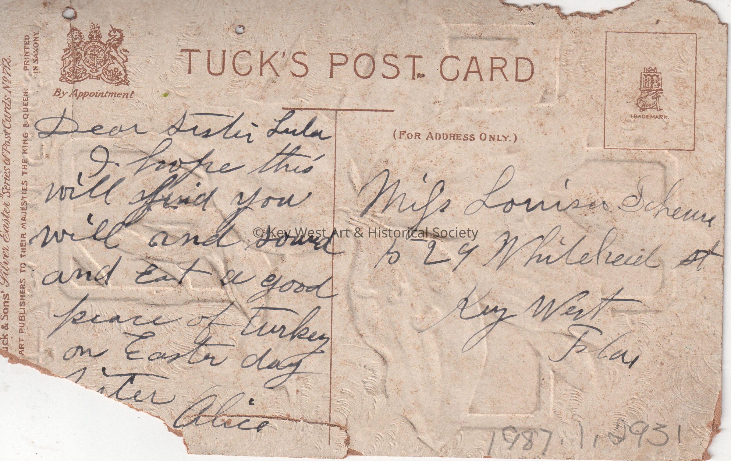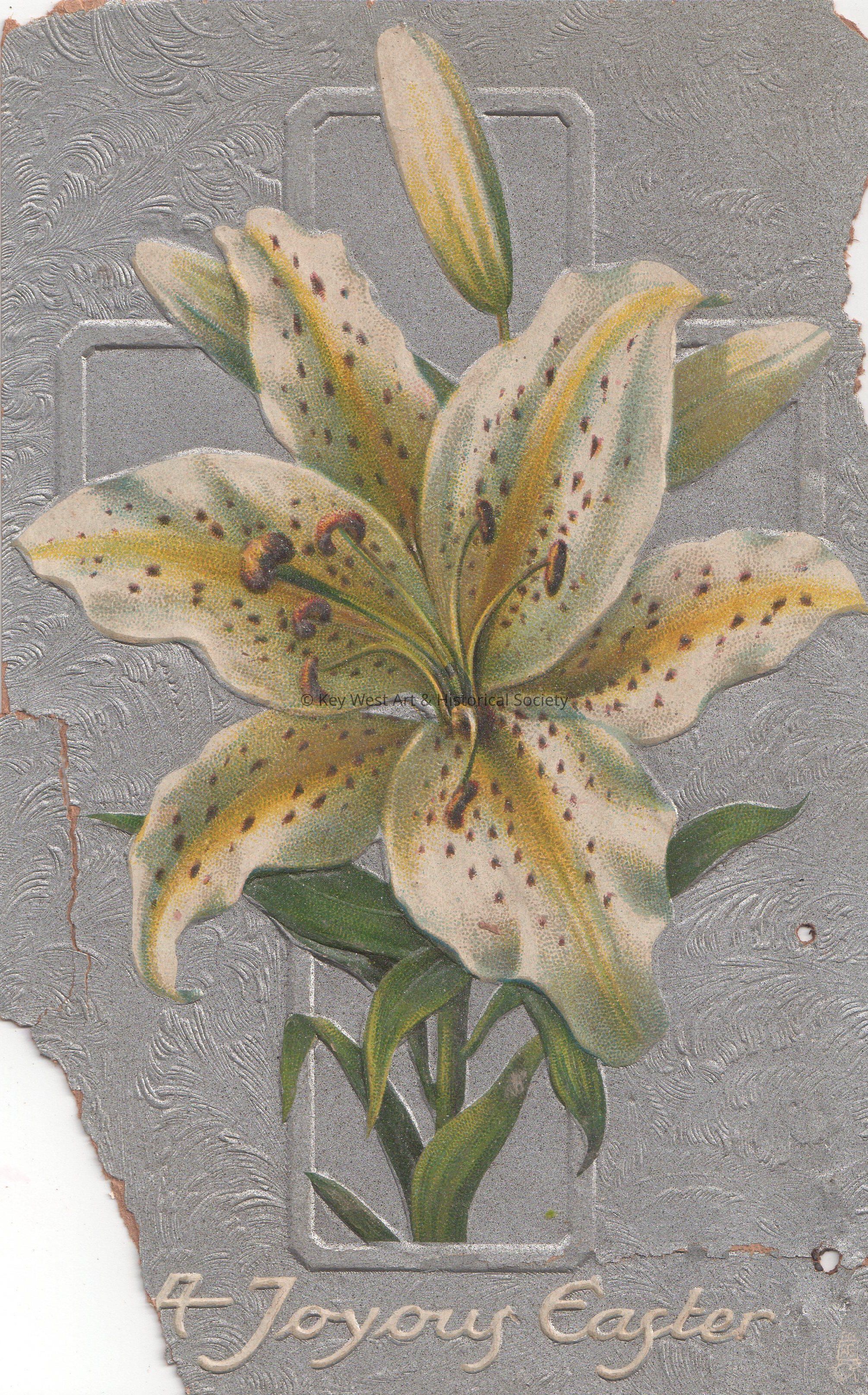 Postcard depicting a lily and a cross. The caption reads, ‘A Joyous Easter’. The message on the verso reads, ‘Dear Sister Lula, I hope this will find you well and sound and eat a good piece of turkey on Easter day. Sister Alice’. The card is addressed to Miss Louisa Scheurer, 529 Whitehead Street, Key West, Florida.Collection