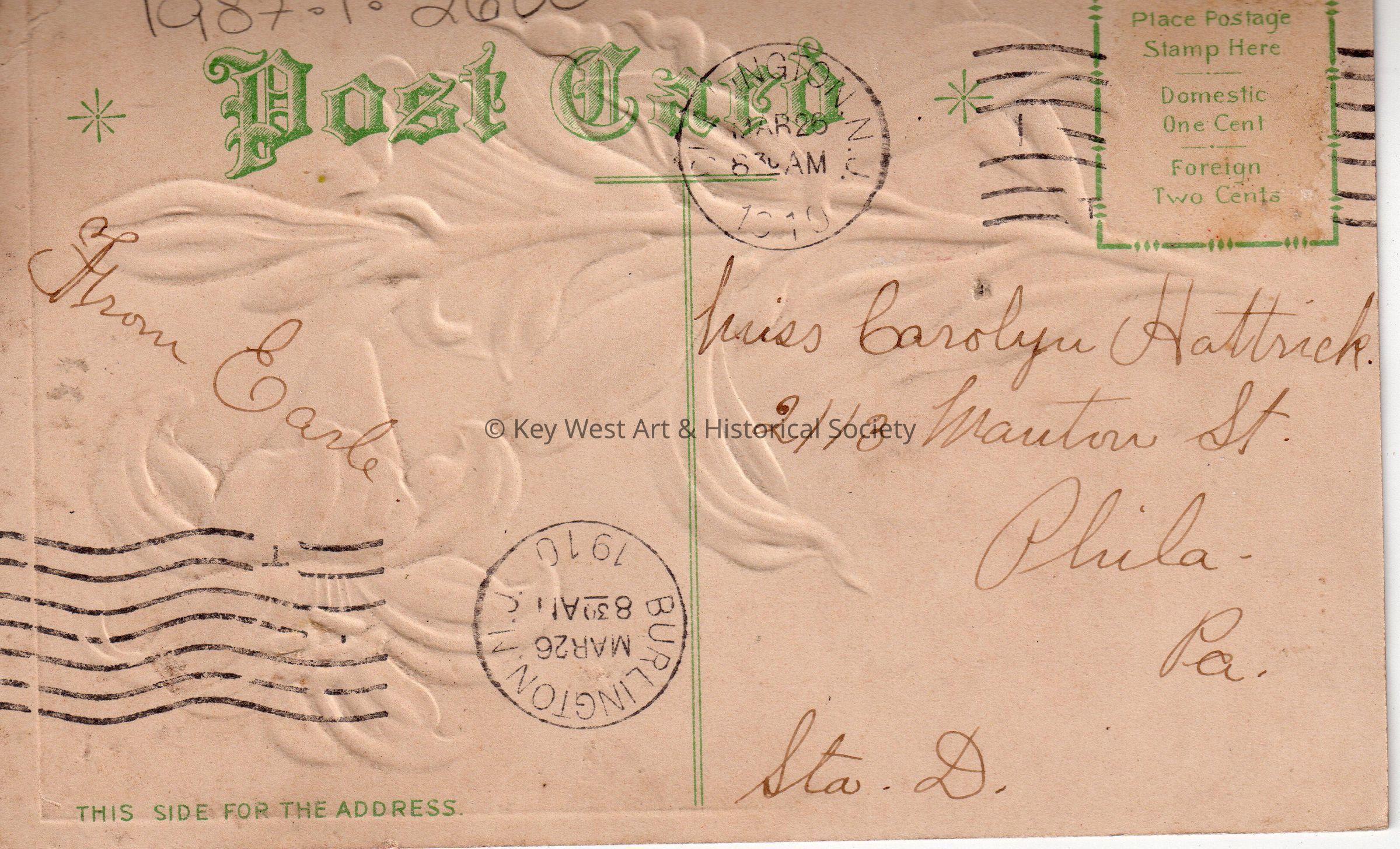 Postcard depicting lilies. The caption reads, ‘Easter Greeting’. The message on the verso reads, ‘From Earle’. The card is addressed to Miss Carolyn Hattrick, 2113 Manton Street, Philadelphia, Pennsylvania, Station D, and is postmarked Burlington, New Jersey, March 26, 1910.Collection