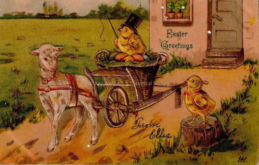 Postcard depicting a chick watching a lamb pull a cart filled with eggs and another chick. The caption reads, ‘Easter Greetings’, and the message on the front reads, ‘From Ellis’. The card is addressed to Mrs. John W. Hattrick, 2012 Latona Street, Southwest Station, Philadelphia, Pennsylvania.Collection