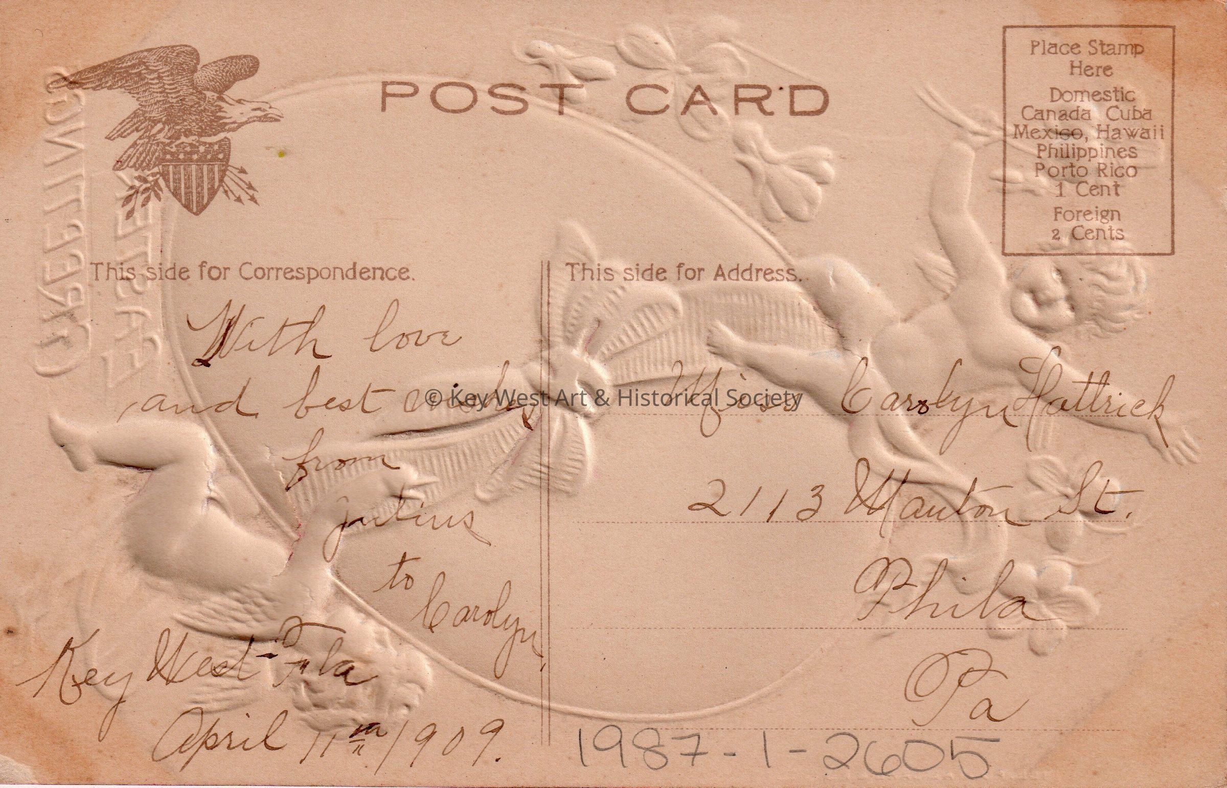 Postcard depicting cupids, flowers, and an egg. The caption reads, ‘Easter Greetings’. The message on the verso reads, ‘With love and best wishes from Julius to Carolyn, Key West, April 11, 1909.’ The card is addressed to Miss Carolyn Hattrick, 2113 Manton Street, Philadelphia, Pennsylvania.Collection