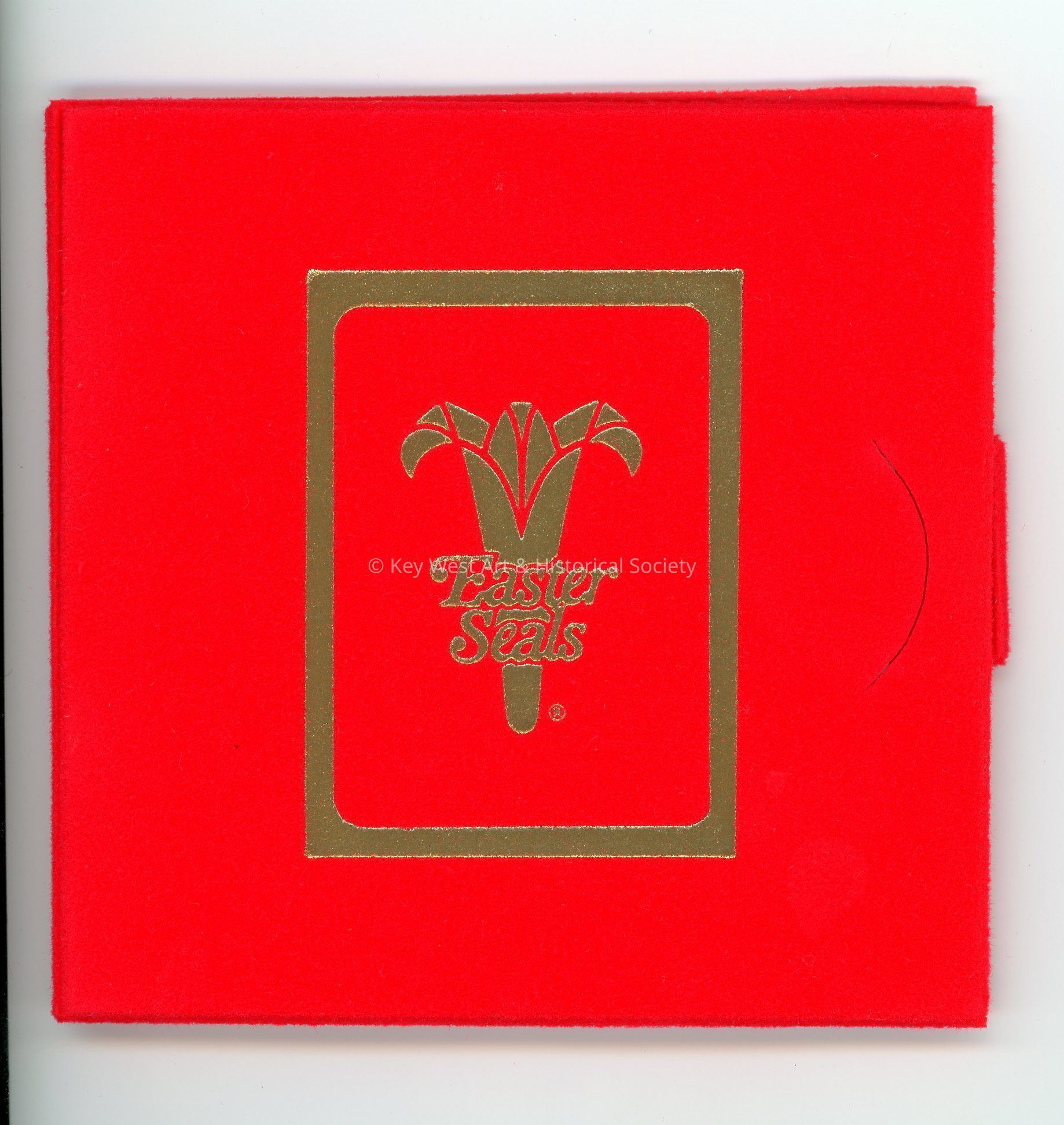 Red felt folder with small slits in the right interior side that hold a Christmas ornament (2015.11.0002a). The front face of the folder has a logo for 'Easter Seals.' The left interior side has a simple pocket holding an order form (2015.11.0002b).