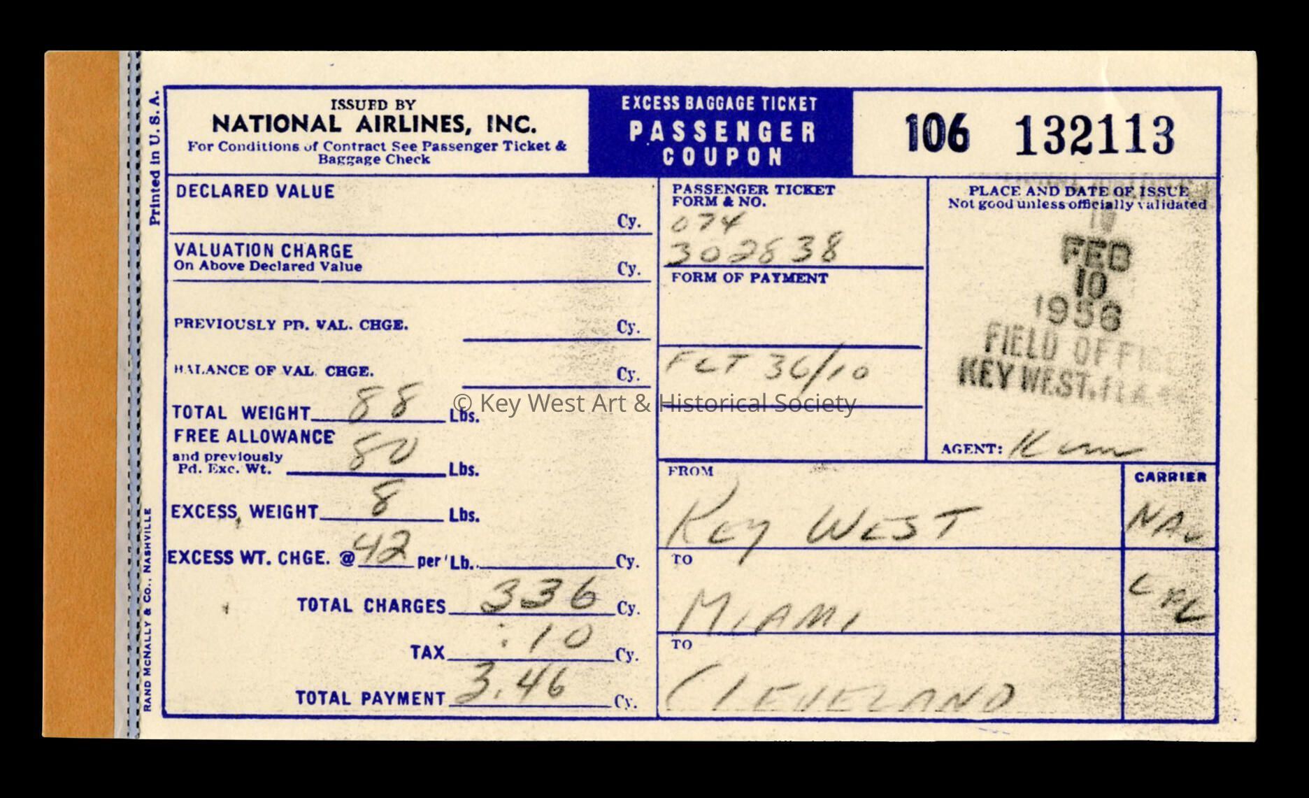 Eastern Air Lines (National Airlines, Inc.) excess baggage ticket passenger coupon issued to Mr. and Mrs. Dick Steigerwald (Richard and Joan) who spent their honeymoon in Key West from January 29 to February 8, 1956.Collection