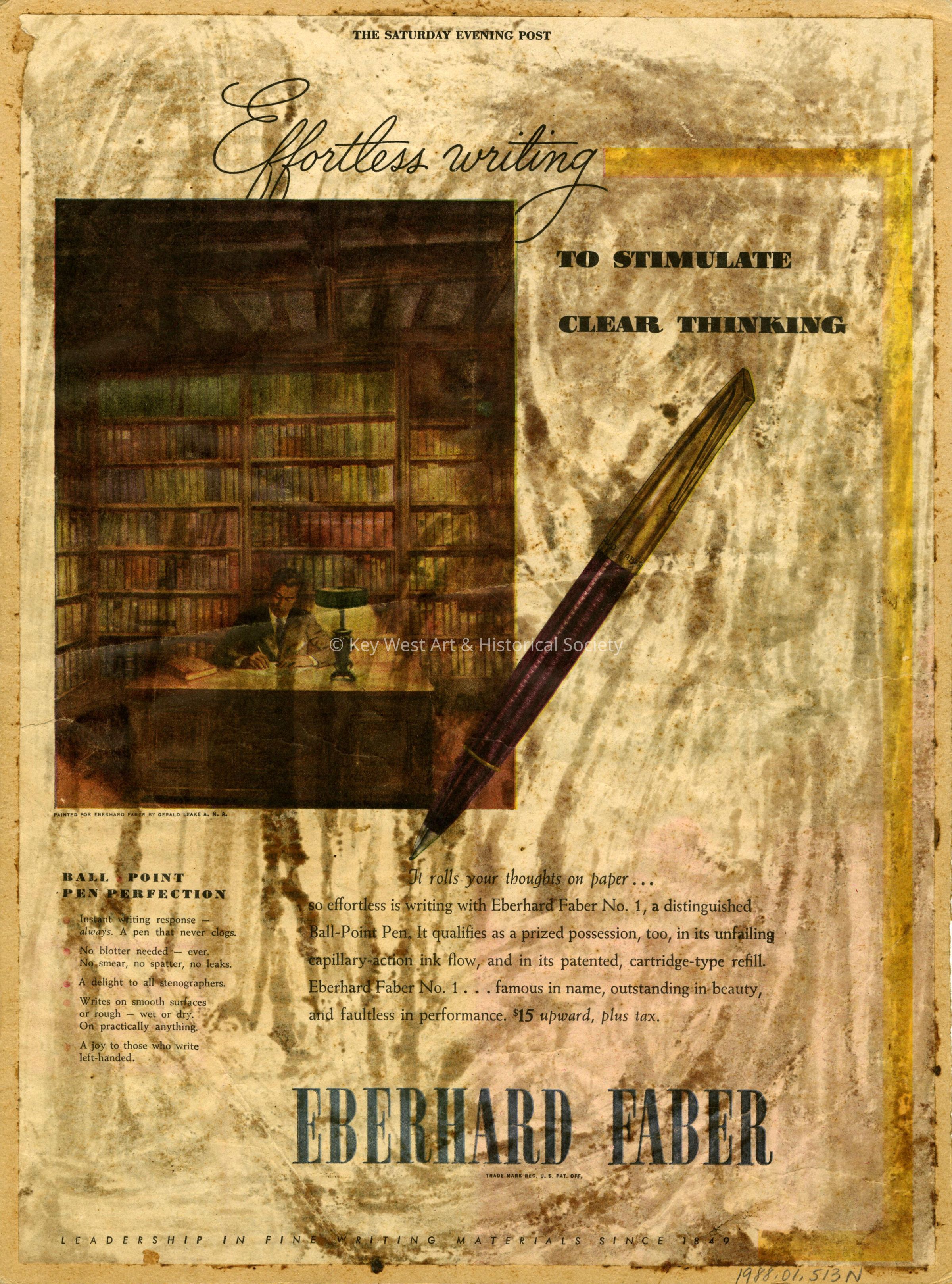 Illustration by Gerald Leake for an Eberhard Faber advertisement. The illustration depicts a man seated behind a desk writing with rows of books behind him. It appeared in The Saturday Evening Post.