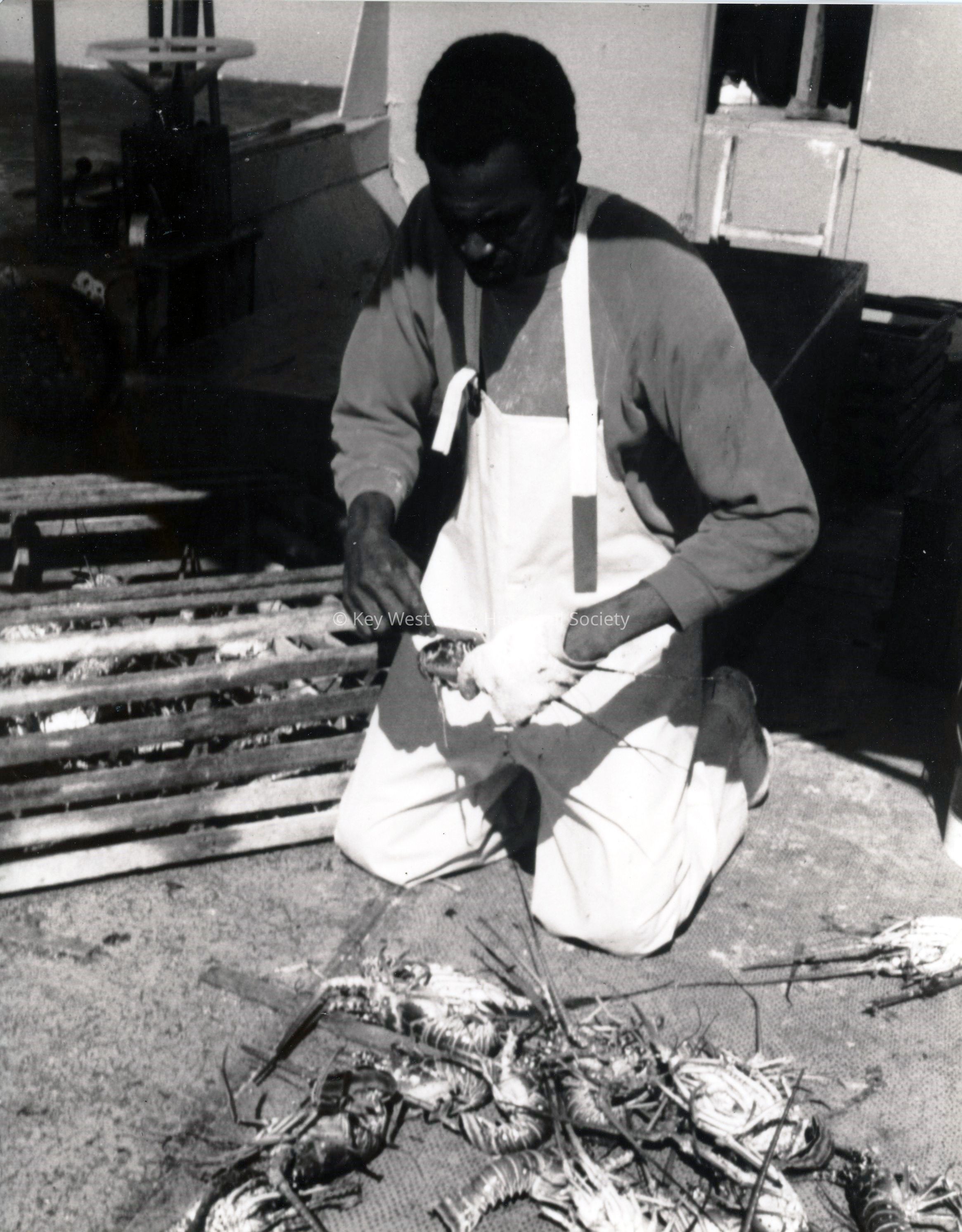 Black and white photograph of an unknown man measuring a lobster carapace on the dock.