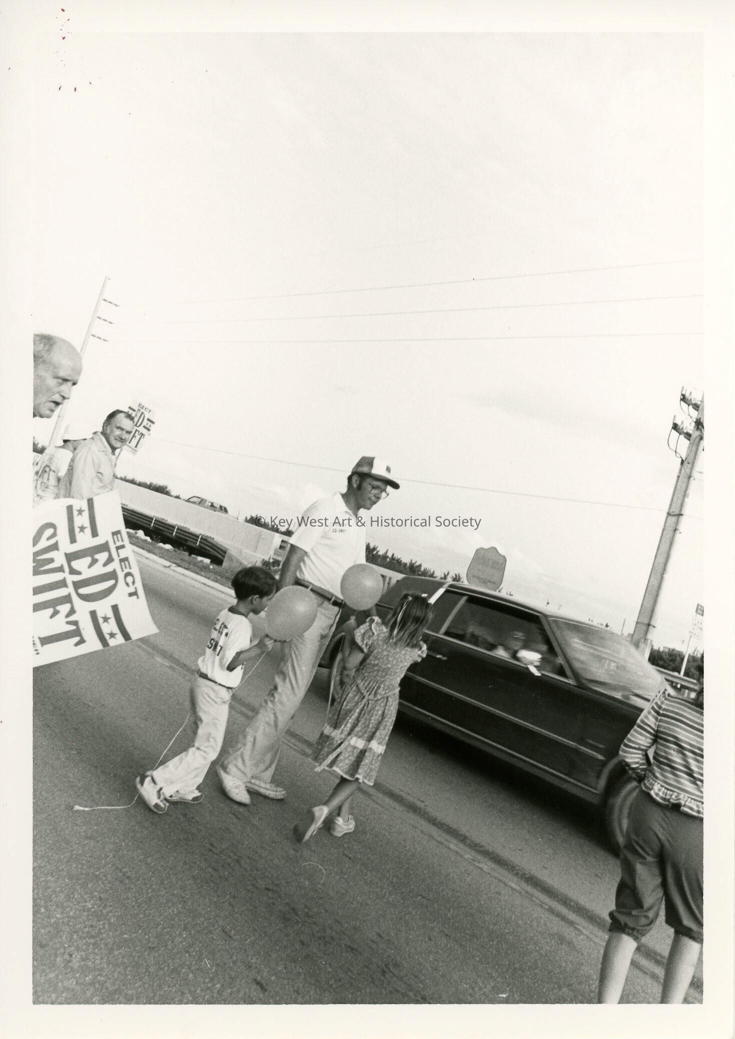 Black and white photograph of Ed Swift and his supporters holding 'Elect Ed Swift' signs possibly during his bid for Monroe County Commissioner.Collection