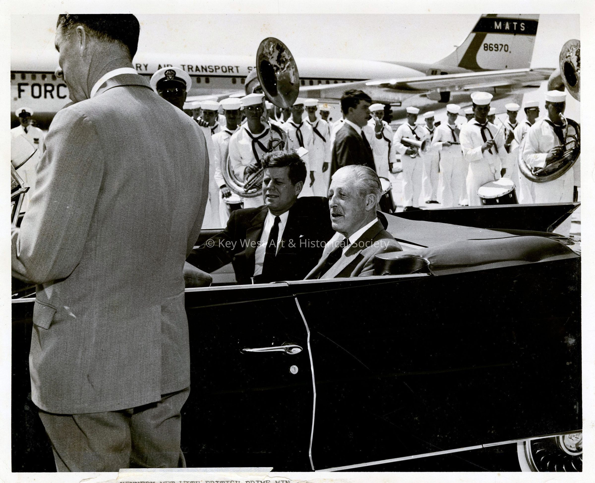 Black and white photograph of U.S. President John F. Kennedy and British Prime Minister Harold Macmillan at Naval Air Station Key West.