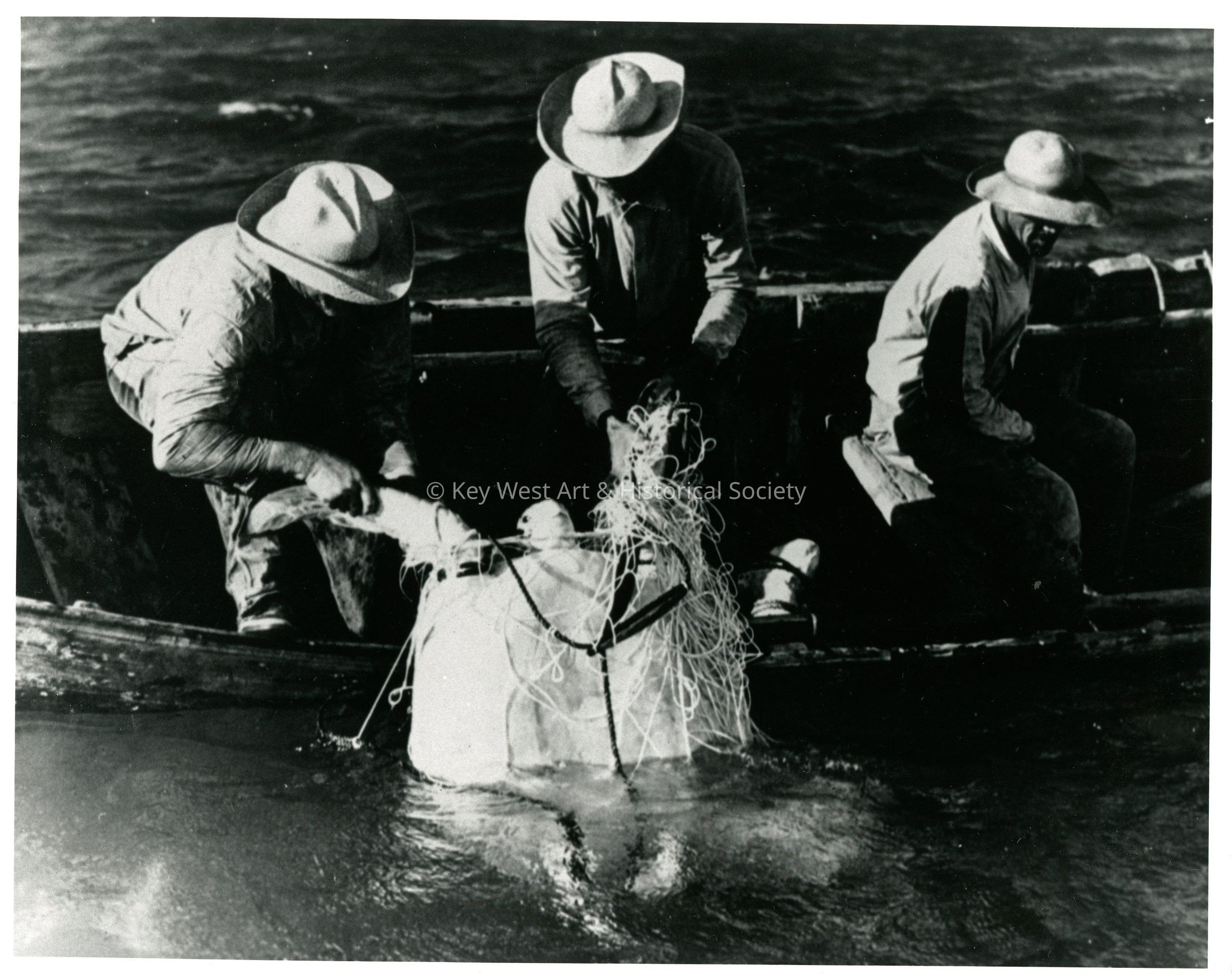 Black and white photograph of three turtle fishermen pulling a turtle tangled in a net onboard a skiff.