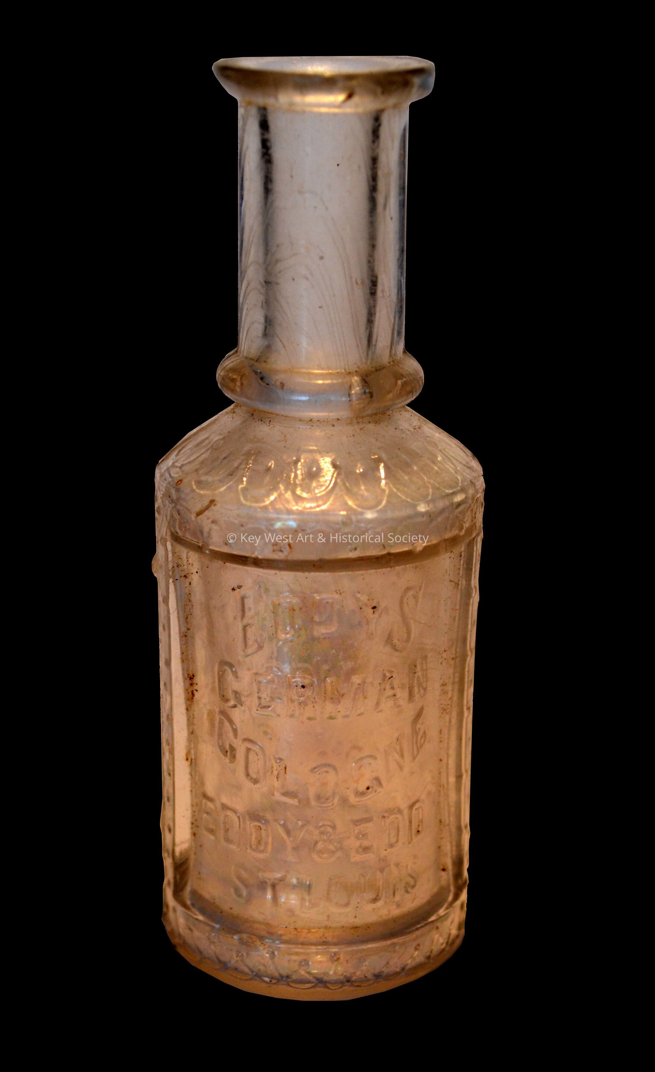 Clear glass bottle embossed with 'Eddys German Cologne Eddy & Eddy St. Louis'. The bottle was originally excavated by the donor's mother, Grace Curlee, during the restoration of Fort Zachary Taylor in the 1960s.