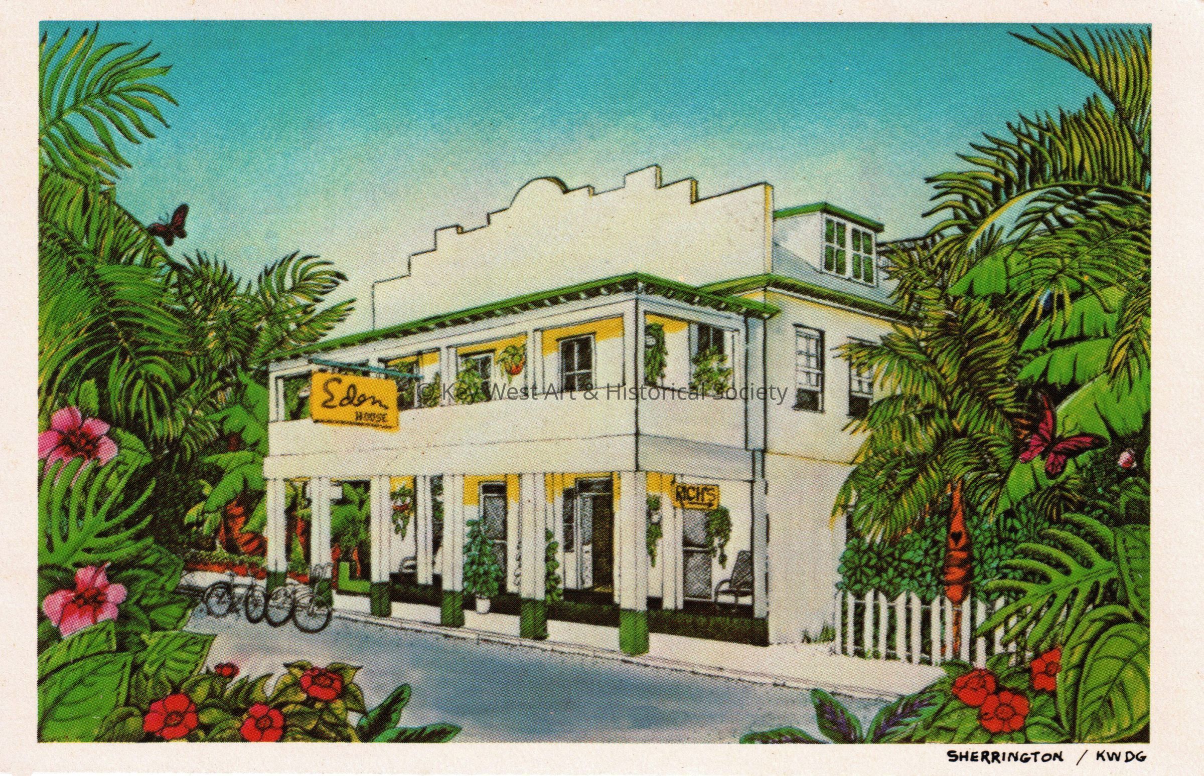 Postcard depicting a drawing of bicycles in front of the Eden House hotel and Rich's restaurant at 1015 Fleming Street. Notation on verso reads, 'Eden House, 1015 Fleming Street, Key West, Florida, 33040. 305-296-6868.'Subject Place