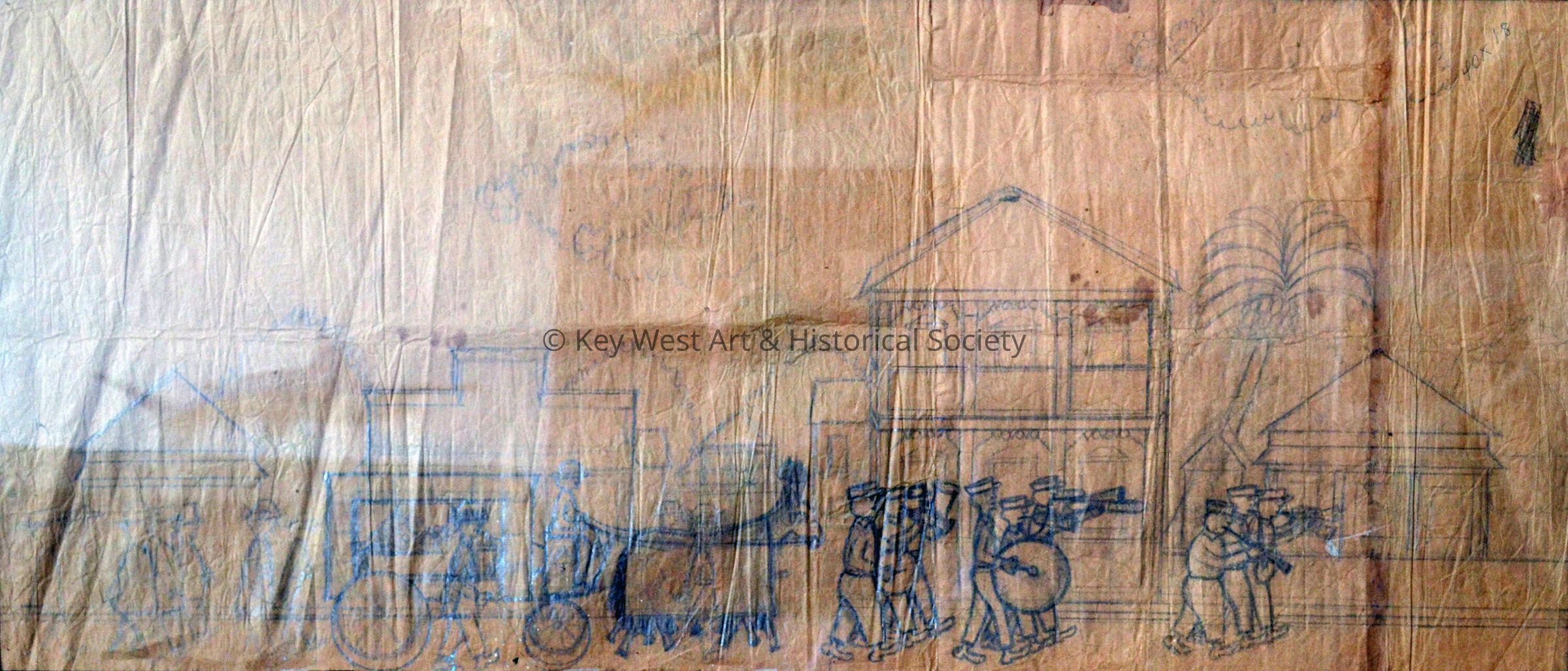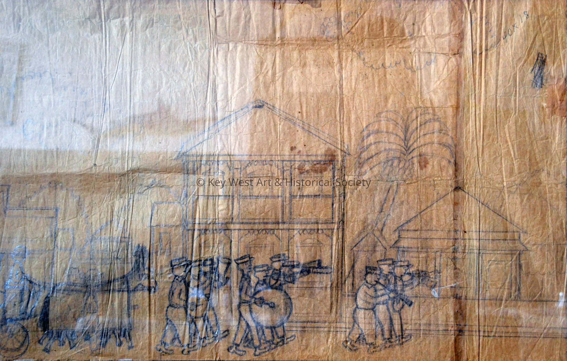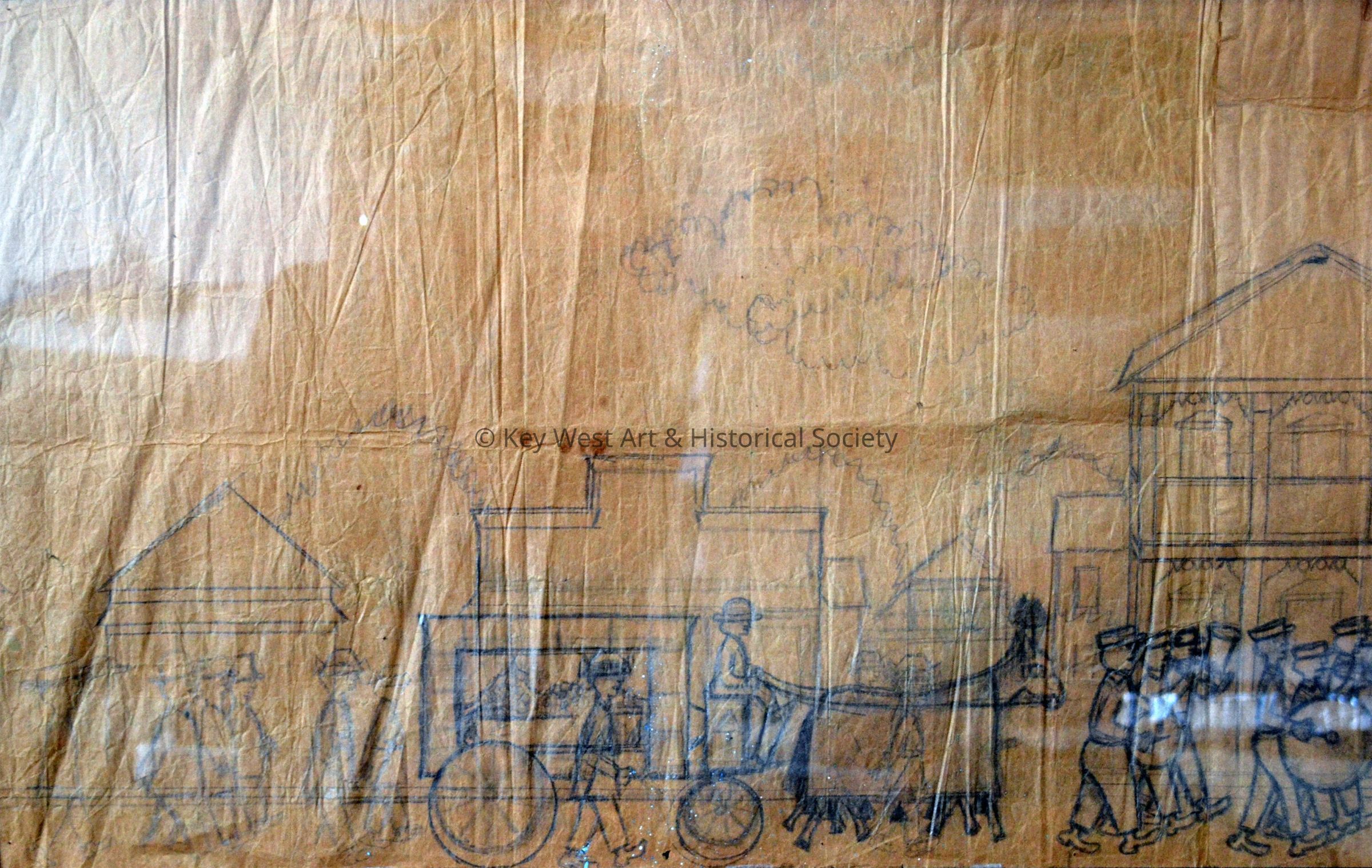 Double-sided pencil sketch on a brown paper grocery bag by Mario Sanchez depicting the Eduardo Hidalgo Gato Cigar Company with Mario's father as The Reader (El Lector) surrounded by cigar makers at the factory on Simonton Street and Virginia Street. On the reverse is a sketch depicting a funeral procession with a horse-drawn hearse and a band marching down an unidentified street.Type of Drawing