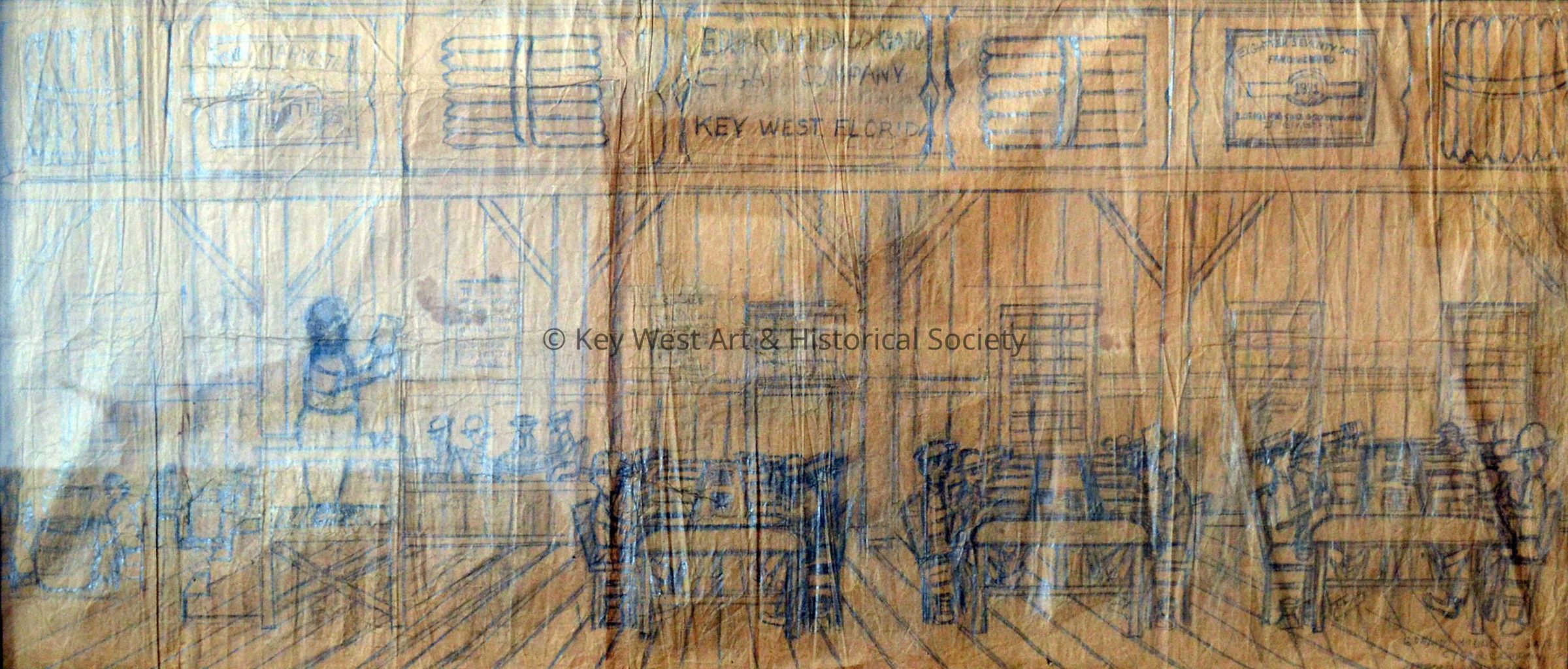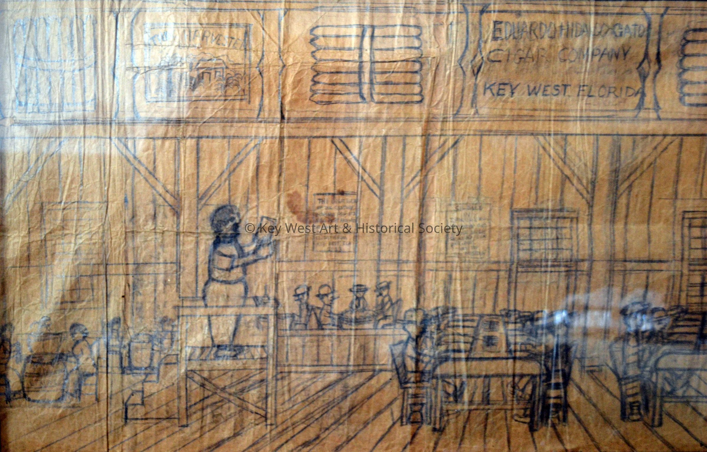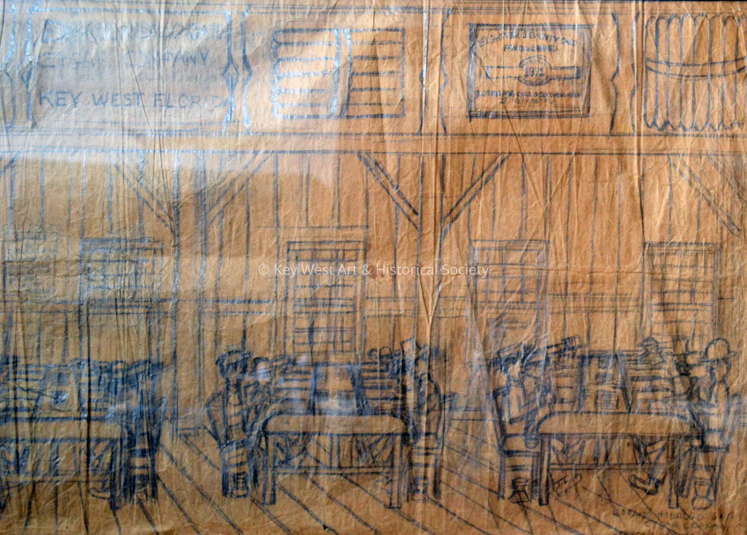 Double-sided pencil sketch on a brown paper grocery bag by Mario Sanchez depicting the Eduardo Hidalgo Gato Cigar Company with Mario's father as The Reader (El Lector) surrounded by cigar makers at the factory on Simonton Street and Virginia Street. On the reverse is a sketch depicting a funeral procession with a horse-drawn hearse and a band marching down an unidentified street.Type of Drawing