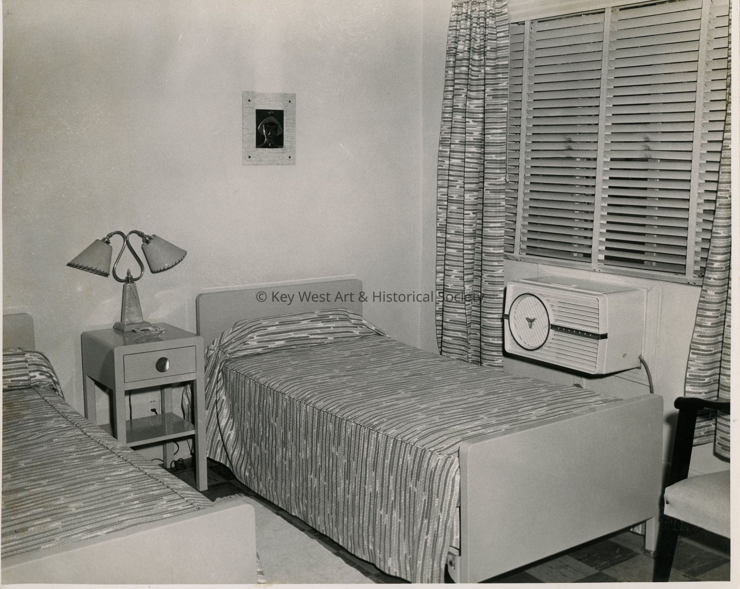 Black and white photograph of a bedroom in the Eduardo Hidalgo Gato house at 1209 Virginia Street. The bedroom window has an air conditioner.