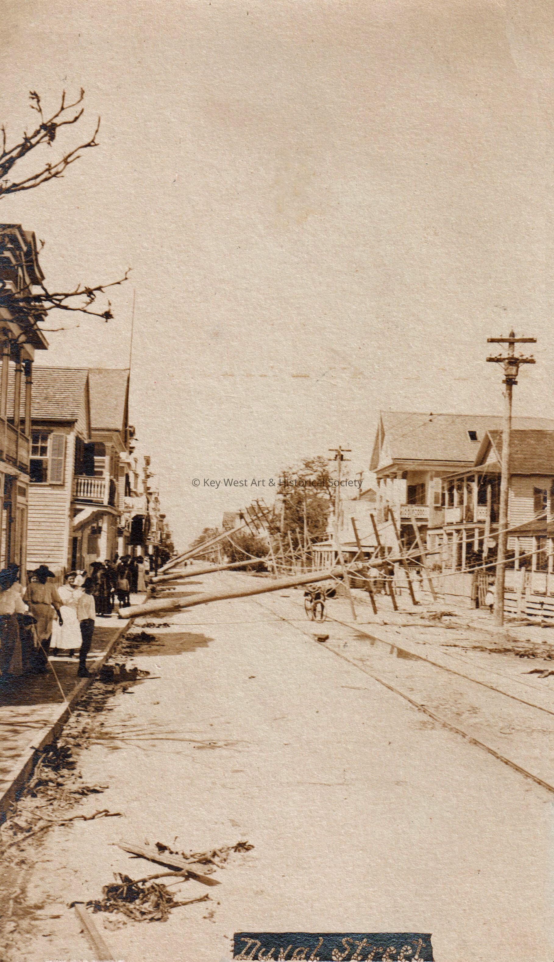 Postcard depicting power poles lying across a street in Key West, Florida. The caption reads, ‘Duval Street.’
