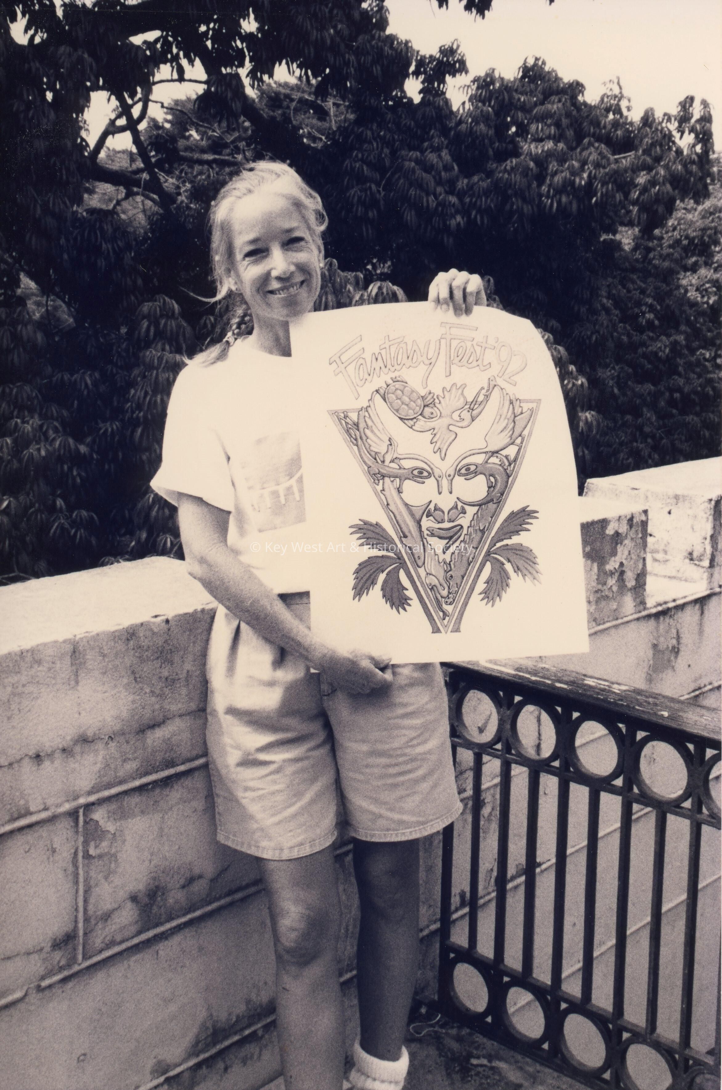 An unknown woman holding up a drawing that reads FF 92.Collection
