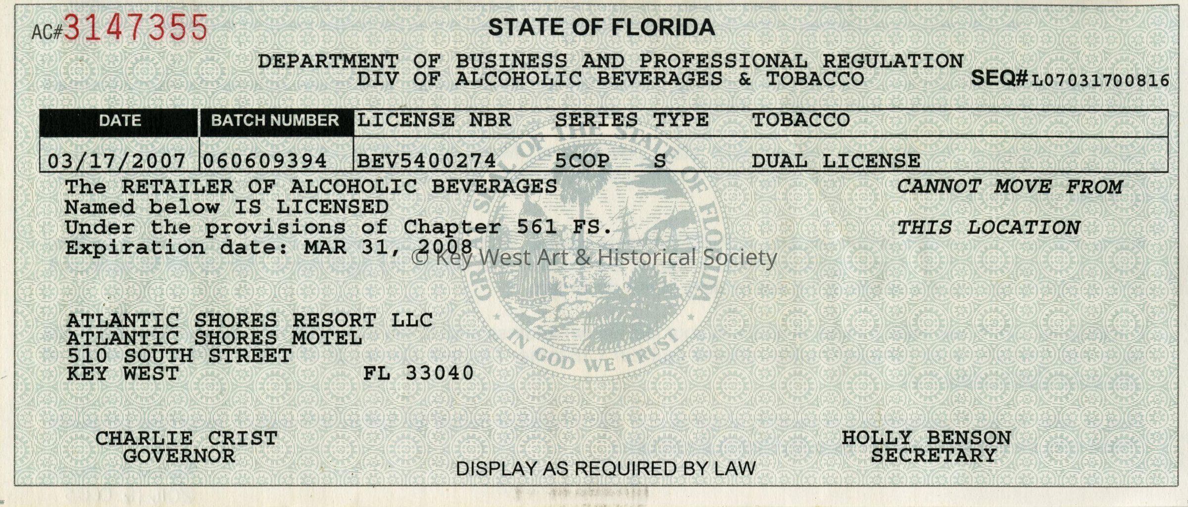 Retailer of Alcholic Beverages License for Atlantic Shores Resort at 510 South Street effective March 17, 2007.