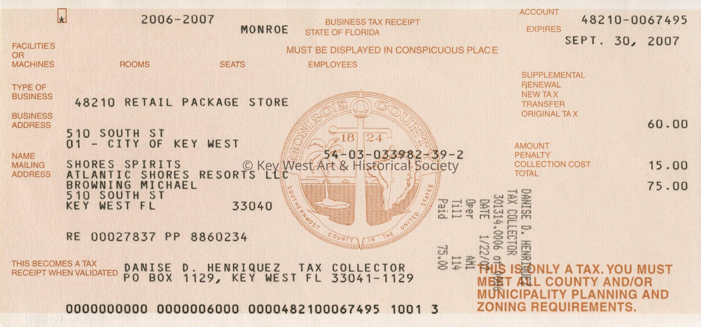 Business Tax Receipt for Atlantic Shores Resort at 510 South Street for the retail package store effective January 22, 2007, issued by the Monroe County Tax Collectors office.Collection