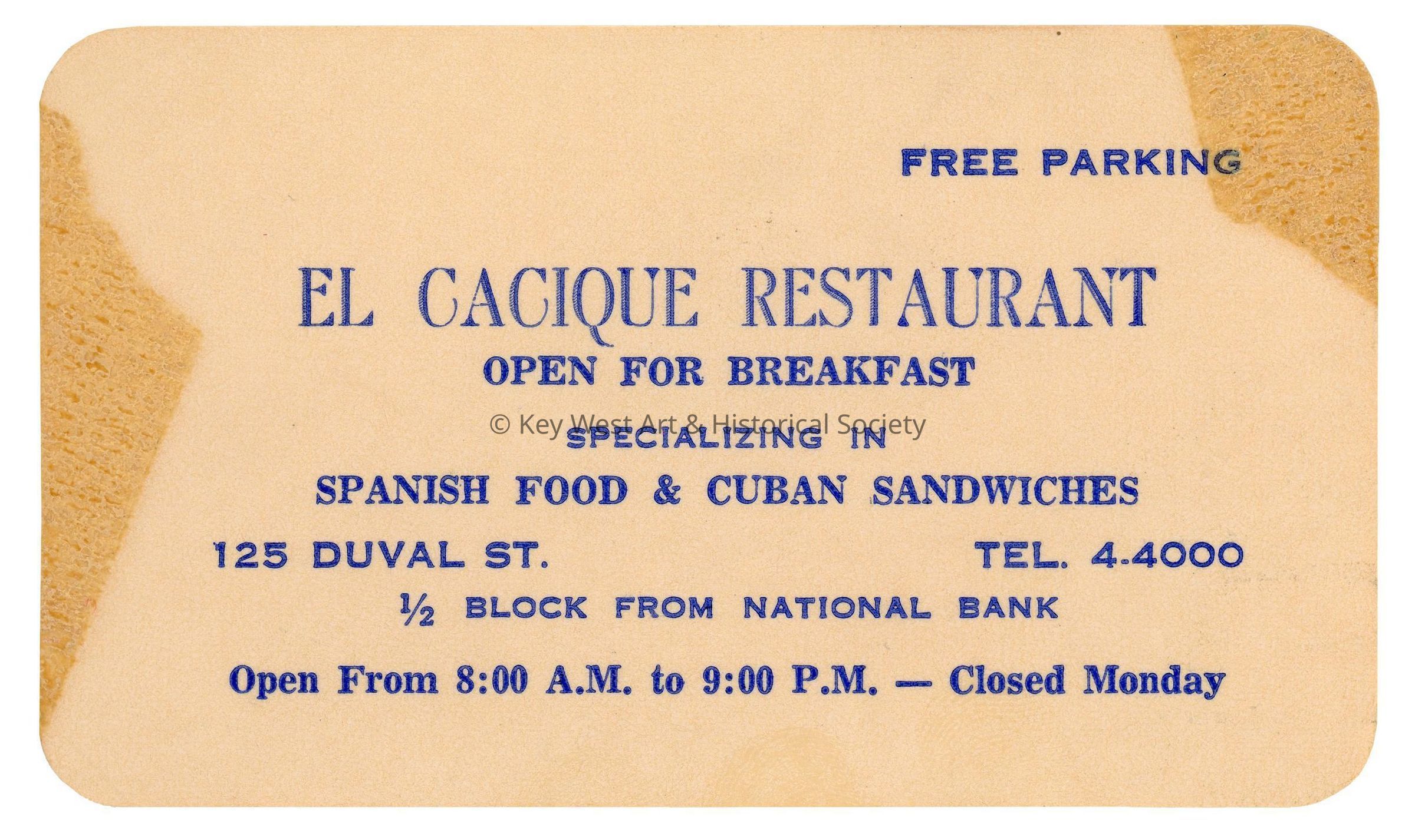 A business card with rounded edges and blue text for El Cacique Restaurant formerly located at 125 Duval Street. The restaurant specialized in Spanish food and Cuban sandwiches.