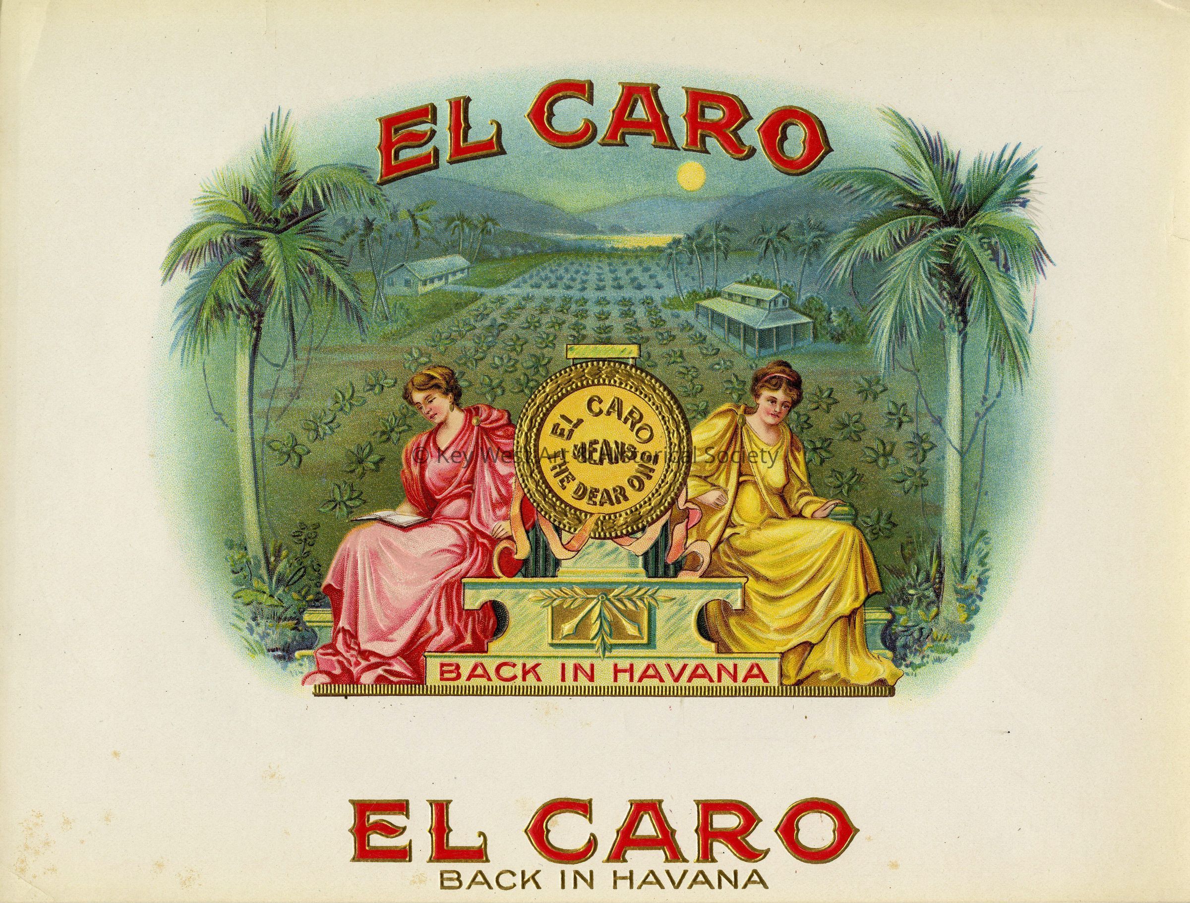 Full color lithograph inner cigar box label promoting El Caro. Likely taken from a sample book produced by the lithographer. Caption reads, 'El Caro, Back in Havana. El Caro means The Dear One'.Type of Print