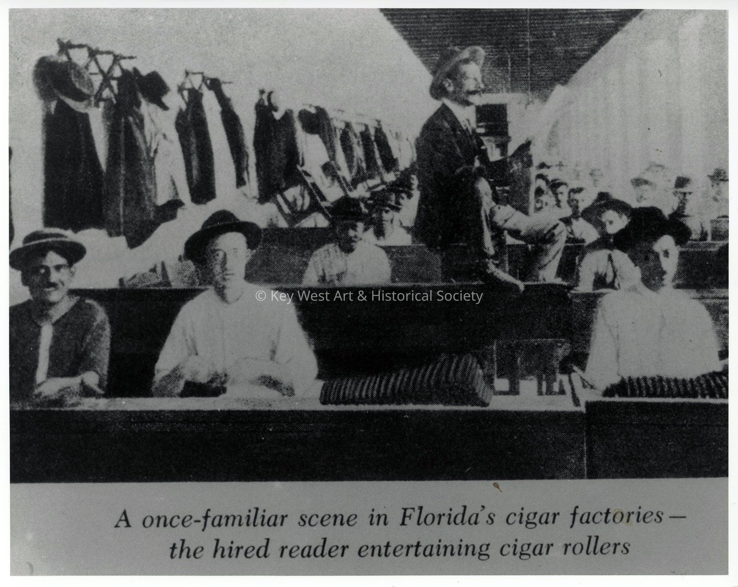 Black and white photograph of El Lector, also known as The Reader, reading a newspaper to the cigar rollers in a factory.