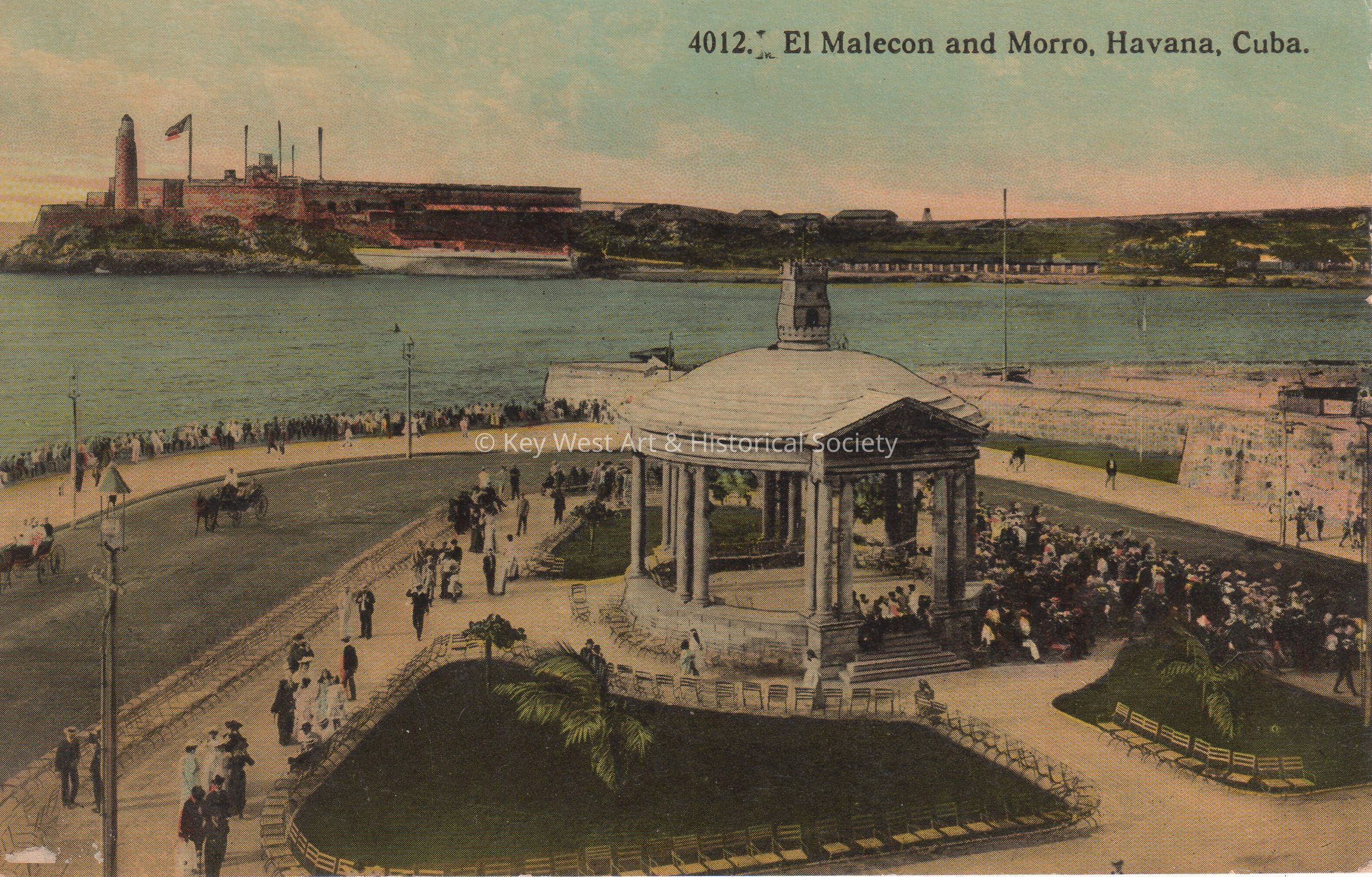 Postcard depicting crowds near a bandstand, the ocean, and a fort in the background. The caption reads, ‘El Malecon and Morro, Havana, Cuba.’Subject Place