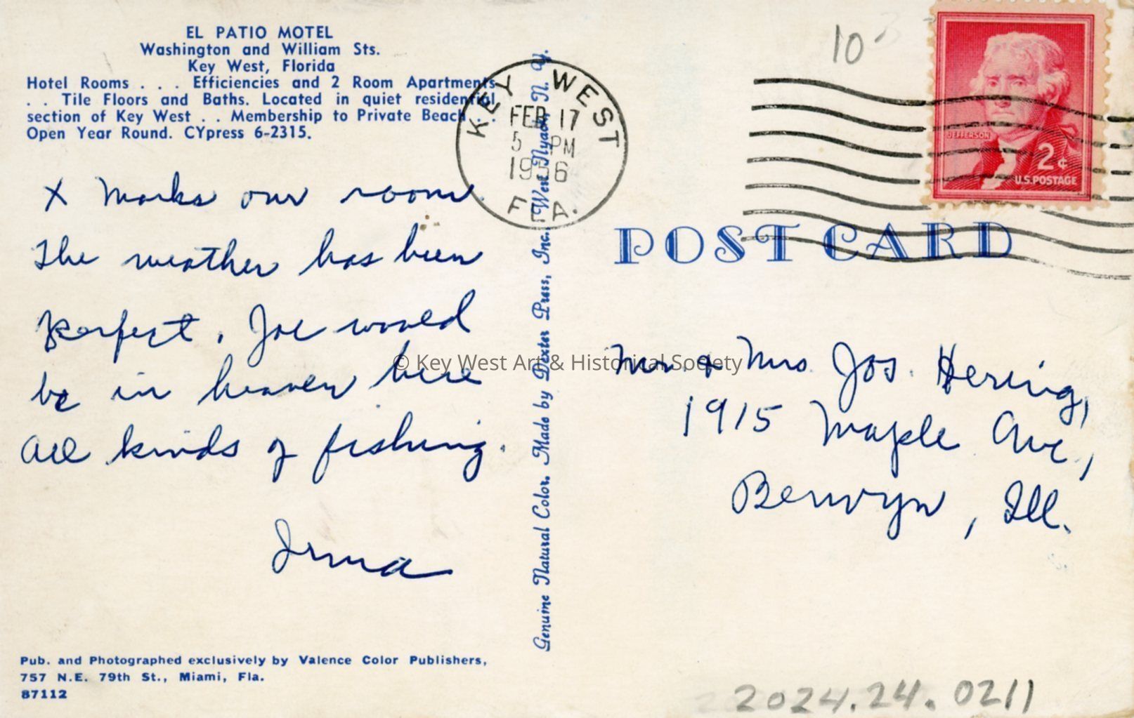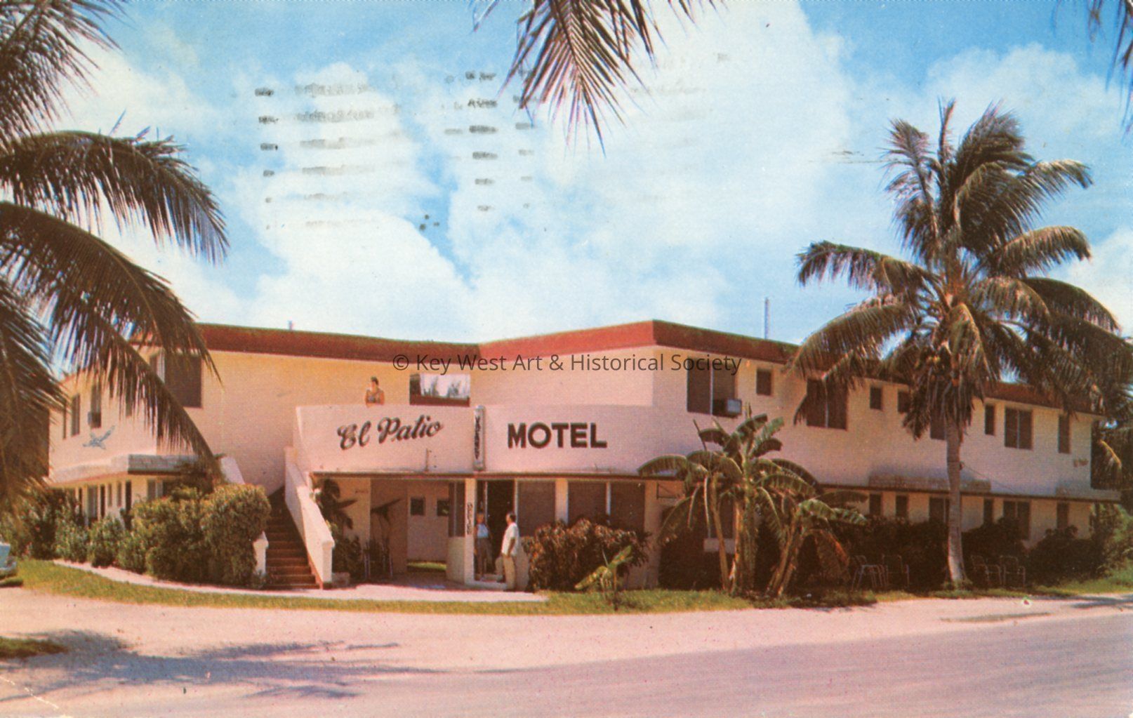 Postcard depicting the El Patio Motel located on the corner of Washington and William streets. Notation on verso, 'Hotel Rooms...Efficiencies and 2 Room Apartments...Tile Floors and Baths. Located in quiet residential section of Key West. Membership to Private Beach...Open Year Round. CYpress 6-2315.'Subject Place