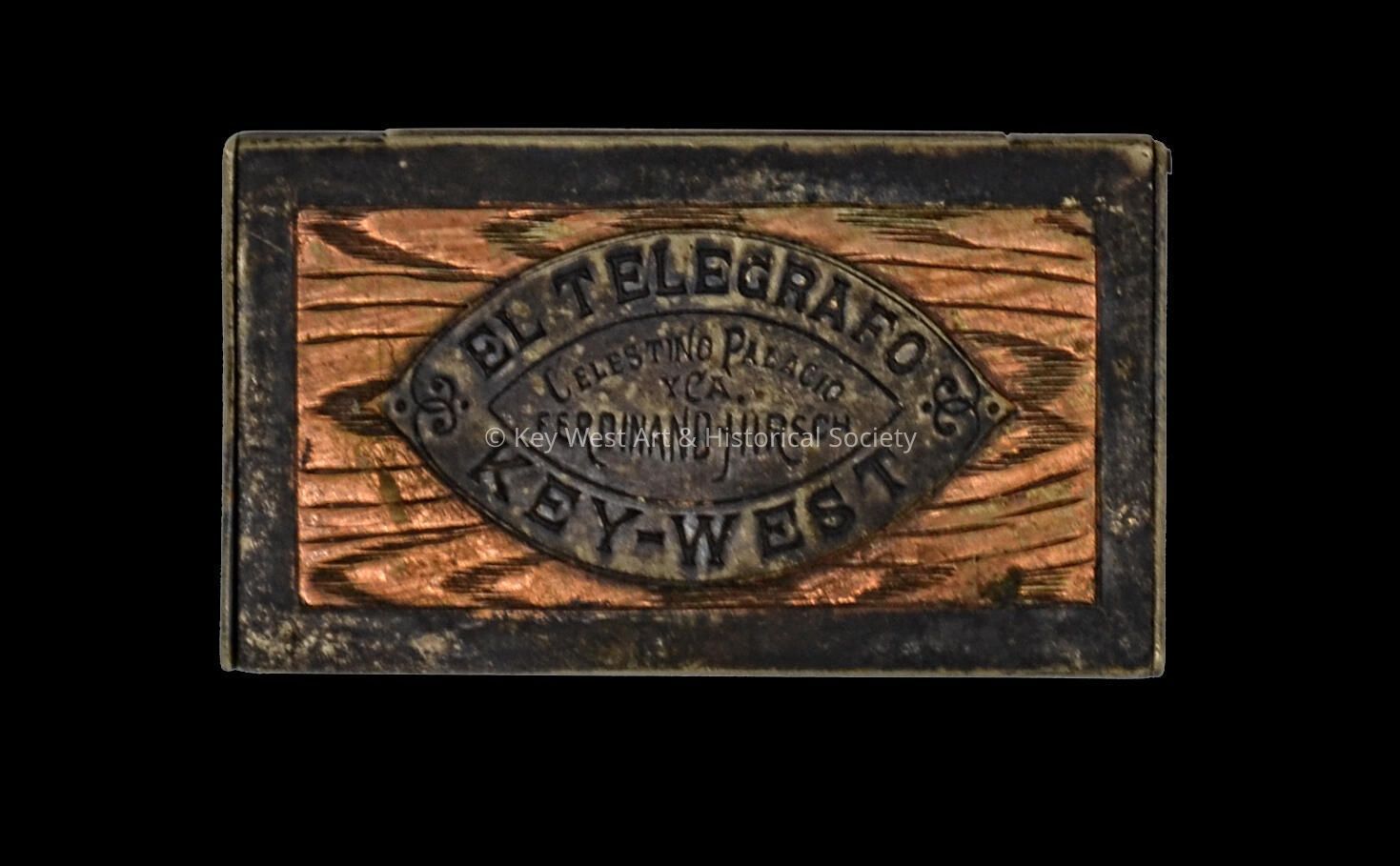 Brass pocket match safe made for the El Telegrafo Key West cigar company. Top of the box engraved with company name and a wood grain pattern on lid. Cartouche on lid engraved with 'El Telegrafo, Celestino Palacio YCA Ferdinano Hirsch Key West'. On the front is 'Factory No. 60'. Hinged lid with striker plate on back.Collection
