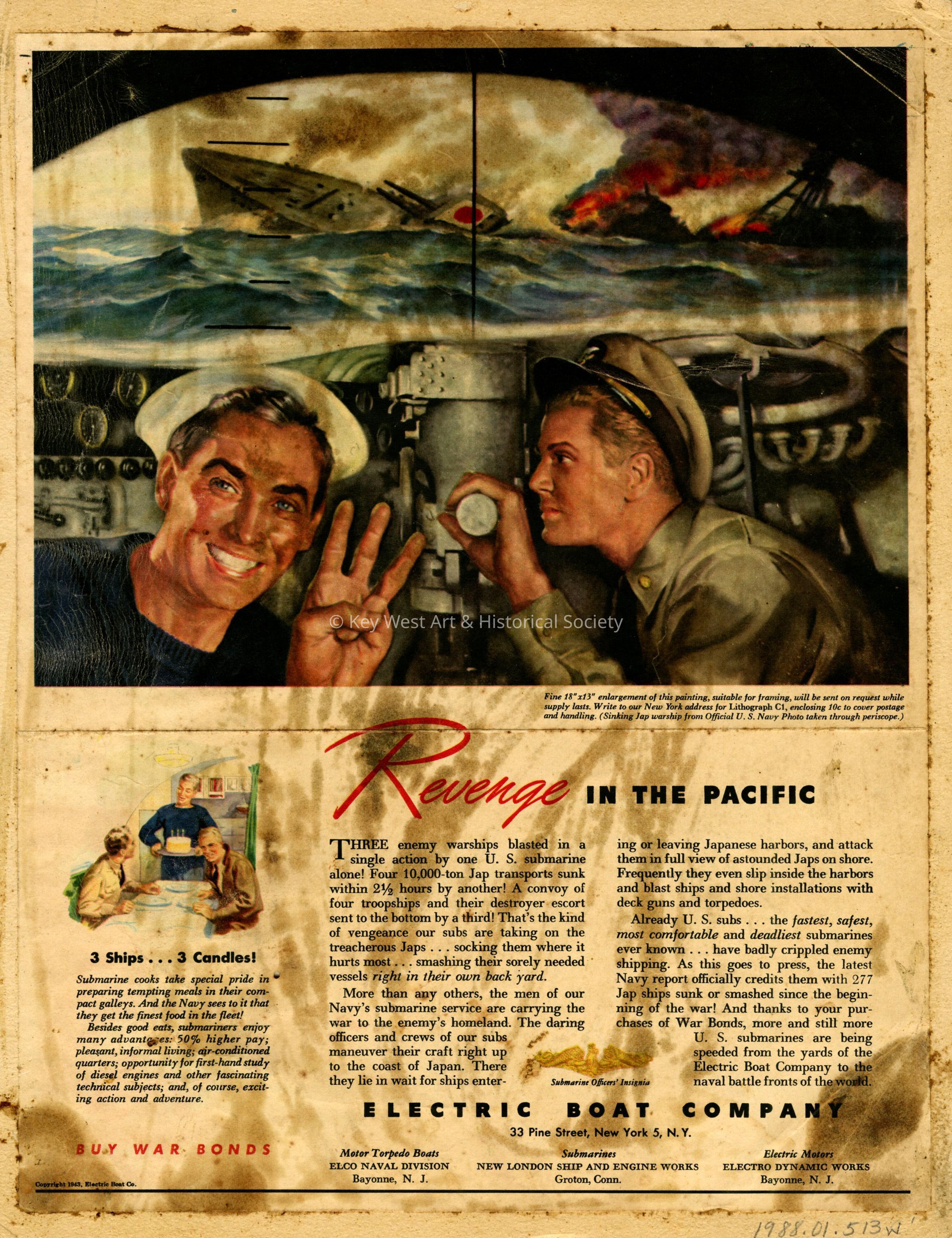 Illustration by Gerald Leake for an Electric Boat Company advertisement. The illustration depicts two Navy submarine sailors, one at a periscope, sinking a Japanese warship during World War II.Collection