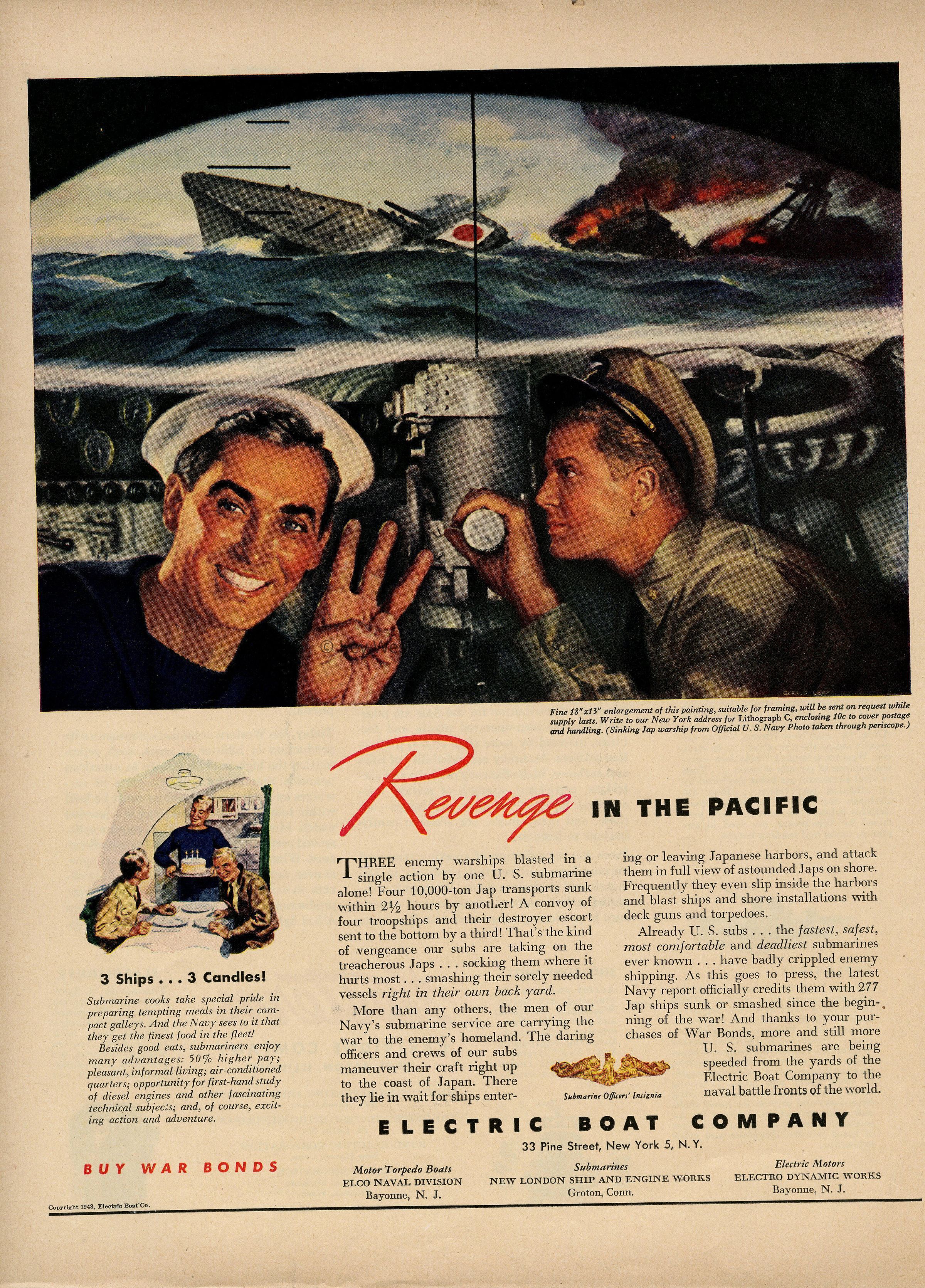 Illustration by Gerald Leake for an Electric Boat Company advertisement. The illustration depicts two Navy submarine sailors, one at a periscope, sinking a Japanese warship during World War II.Collection