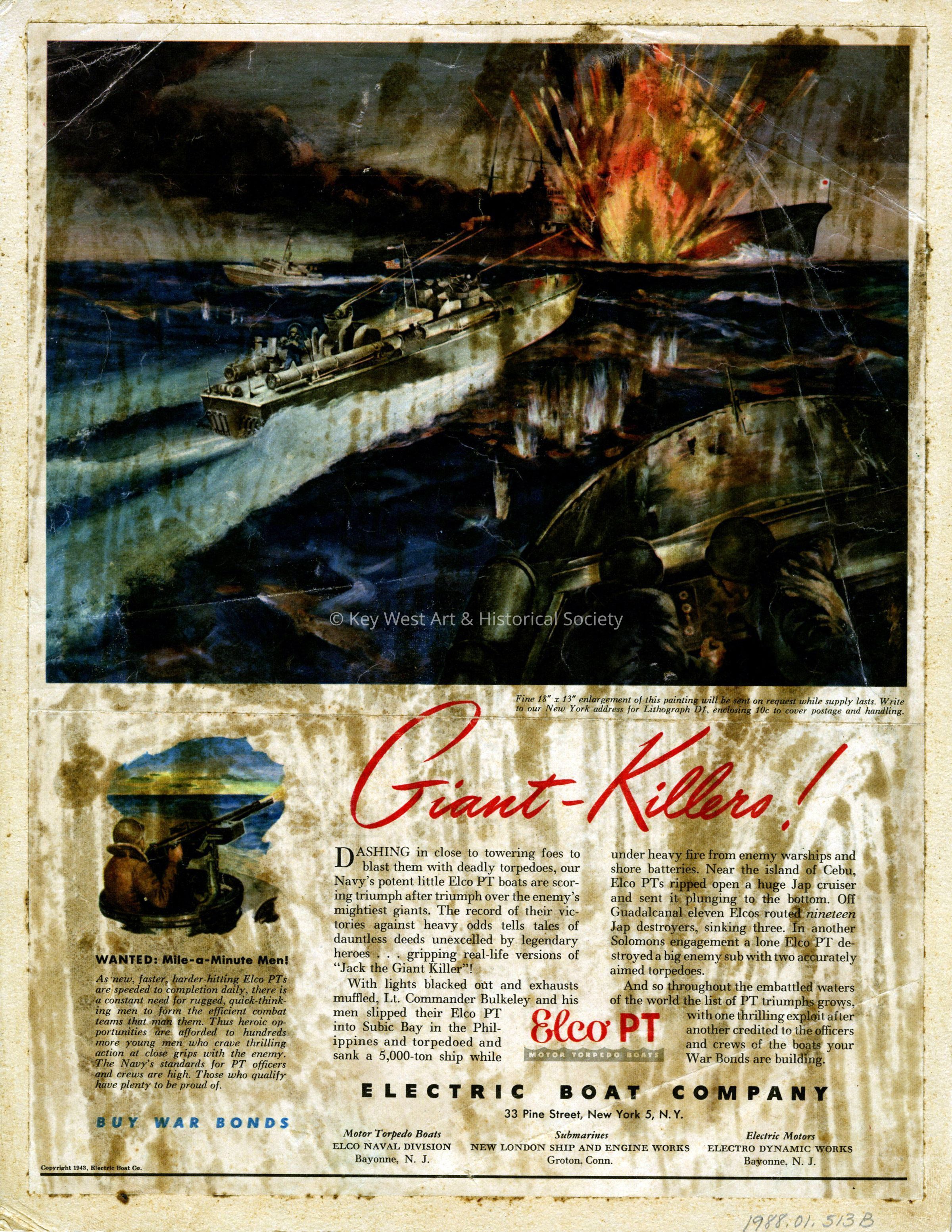 Illustration by Gerald Leake for an Electric Boat Company advertisement. The illustration depicts an Elco PT motor torpedo boat sinking a ship in the Philippines during World War II.