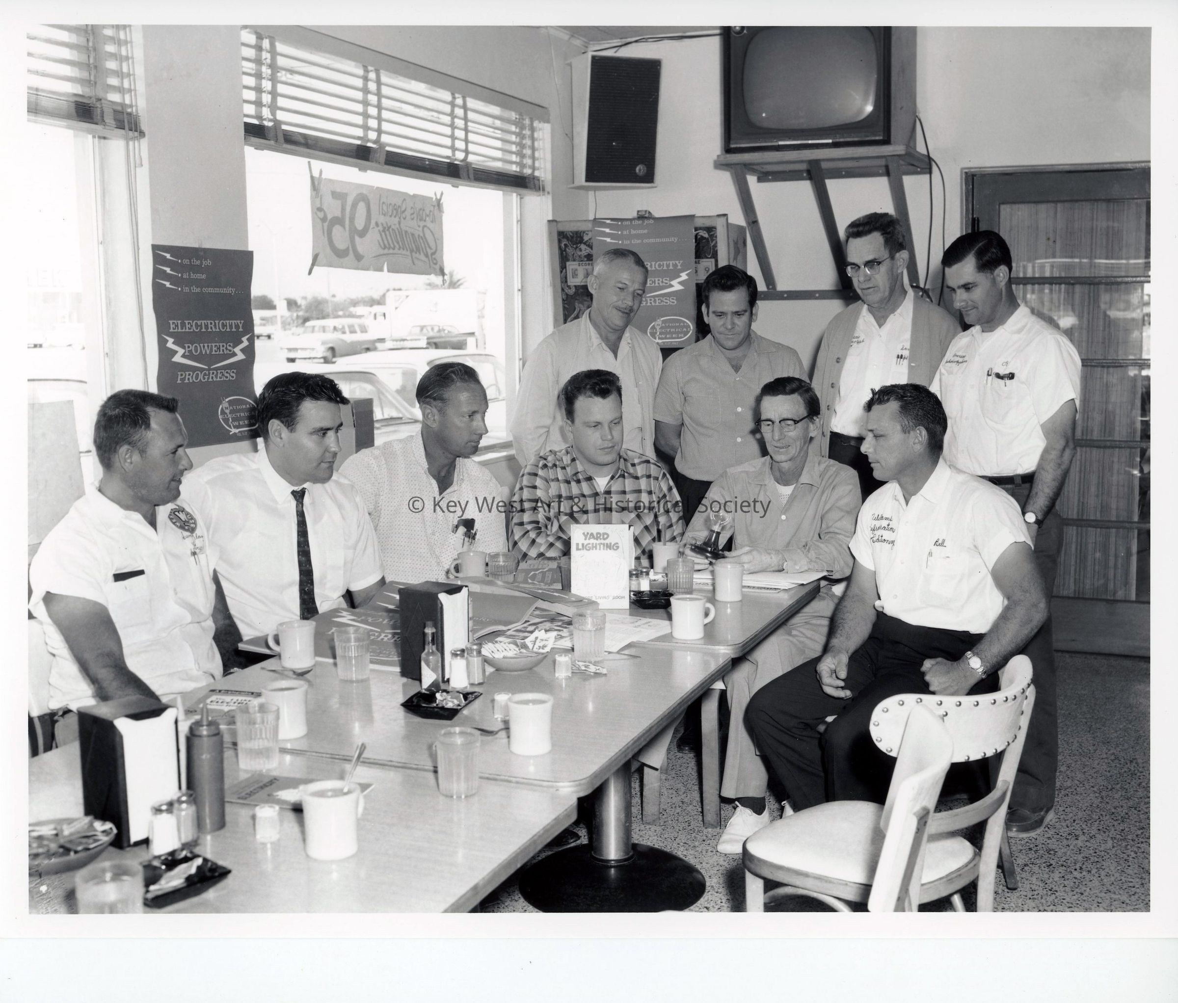 Black and white photograph of a group of Electric Company employees meeting in a cafe.