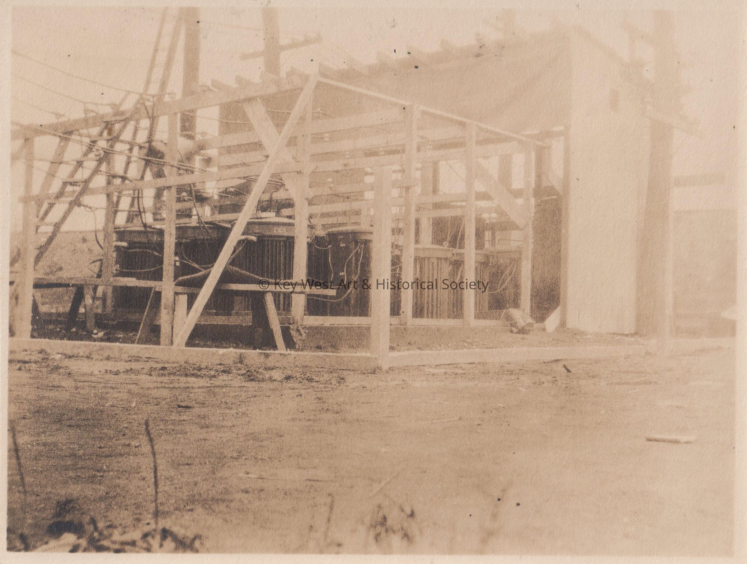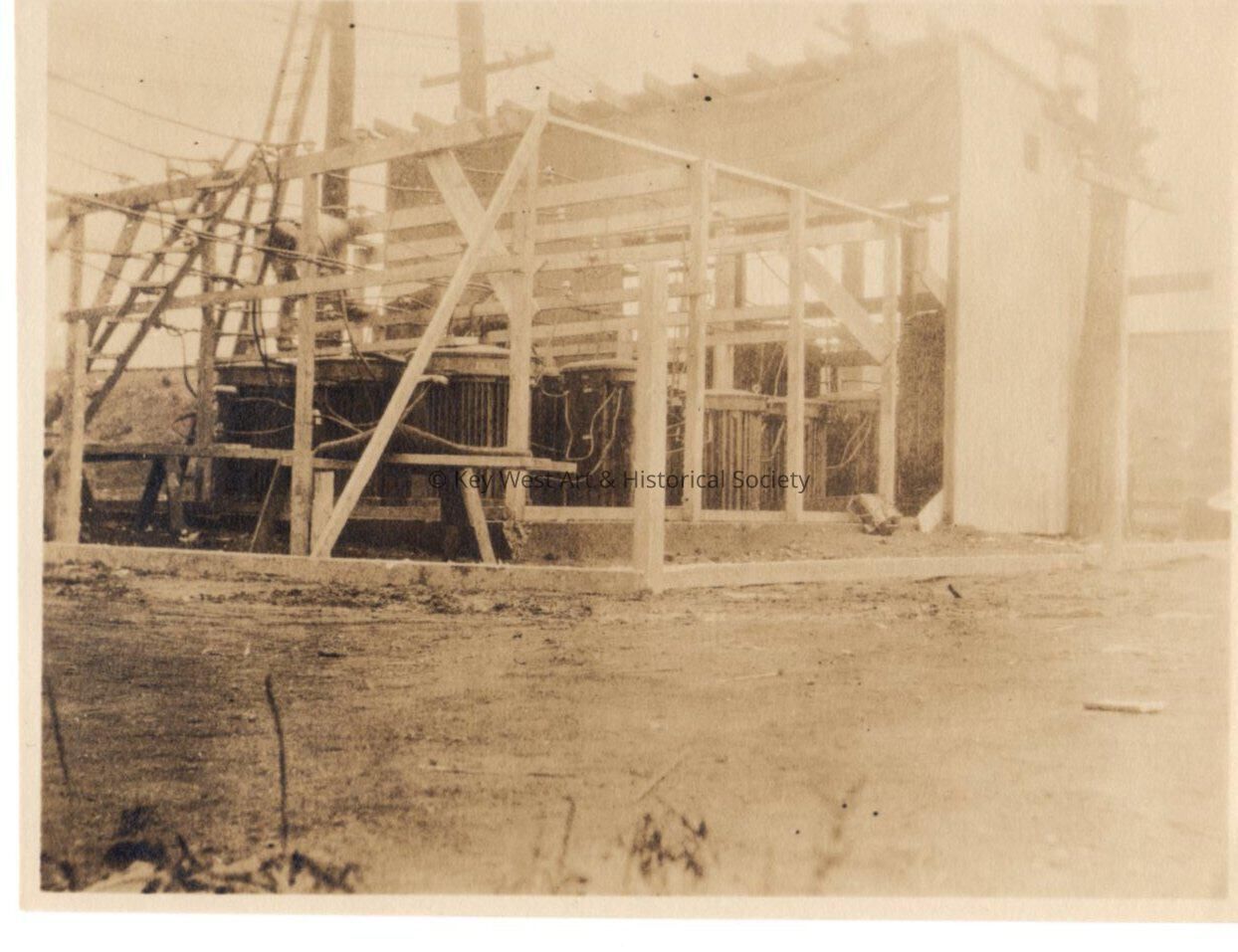 Black and white photo of a man working on damaged electrical equipment caused by a storm. Blackstone Gas and Electric Co.Collection