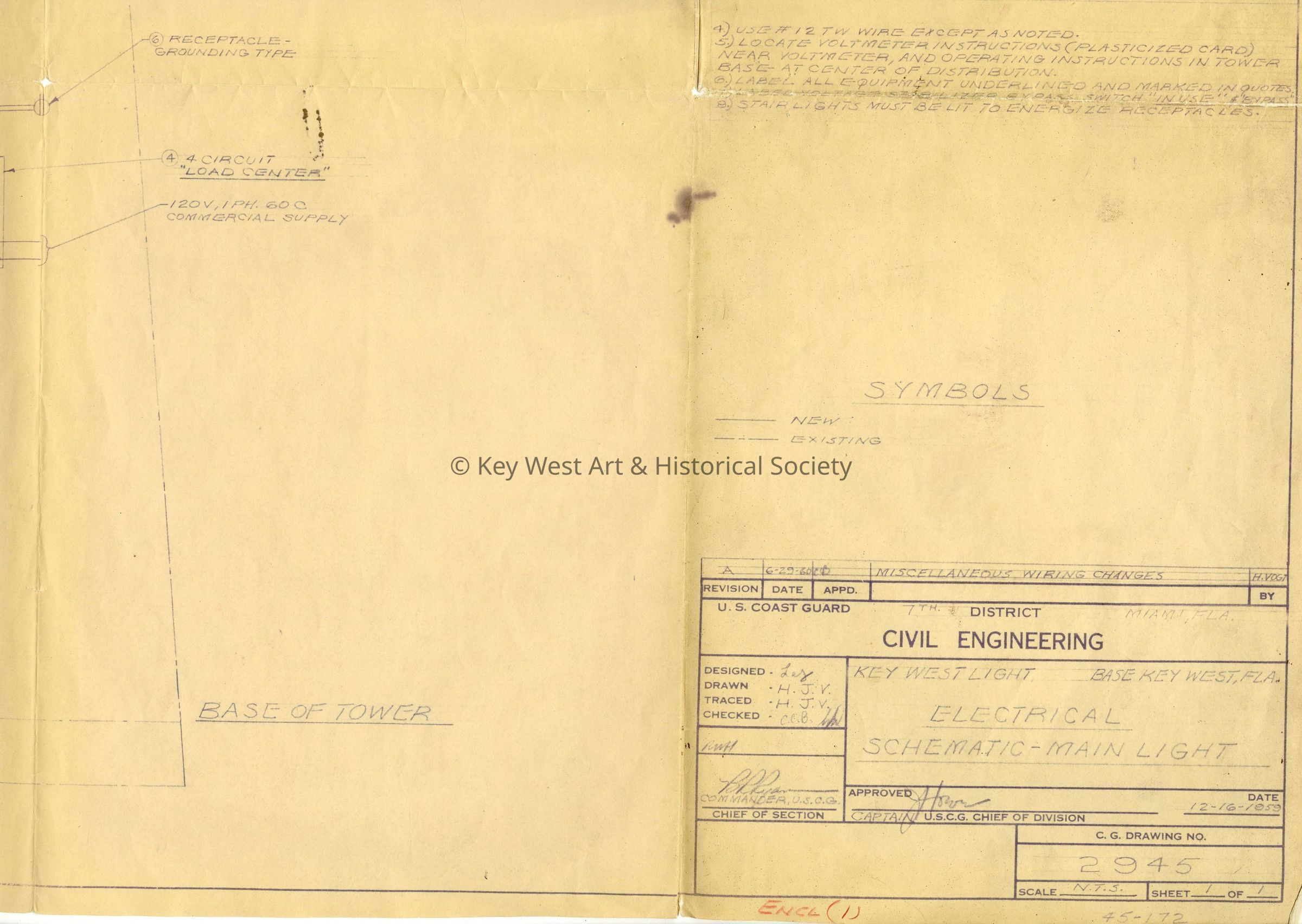 Blueprint drawing titled, 'Electrical Schematic - Main Light' for the Key West Lighthouse. Issued from the Office of Civil Engineering.