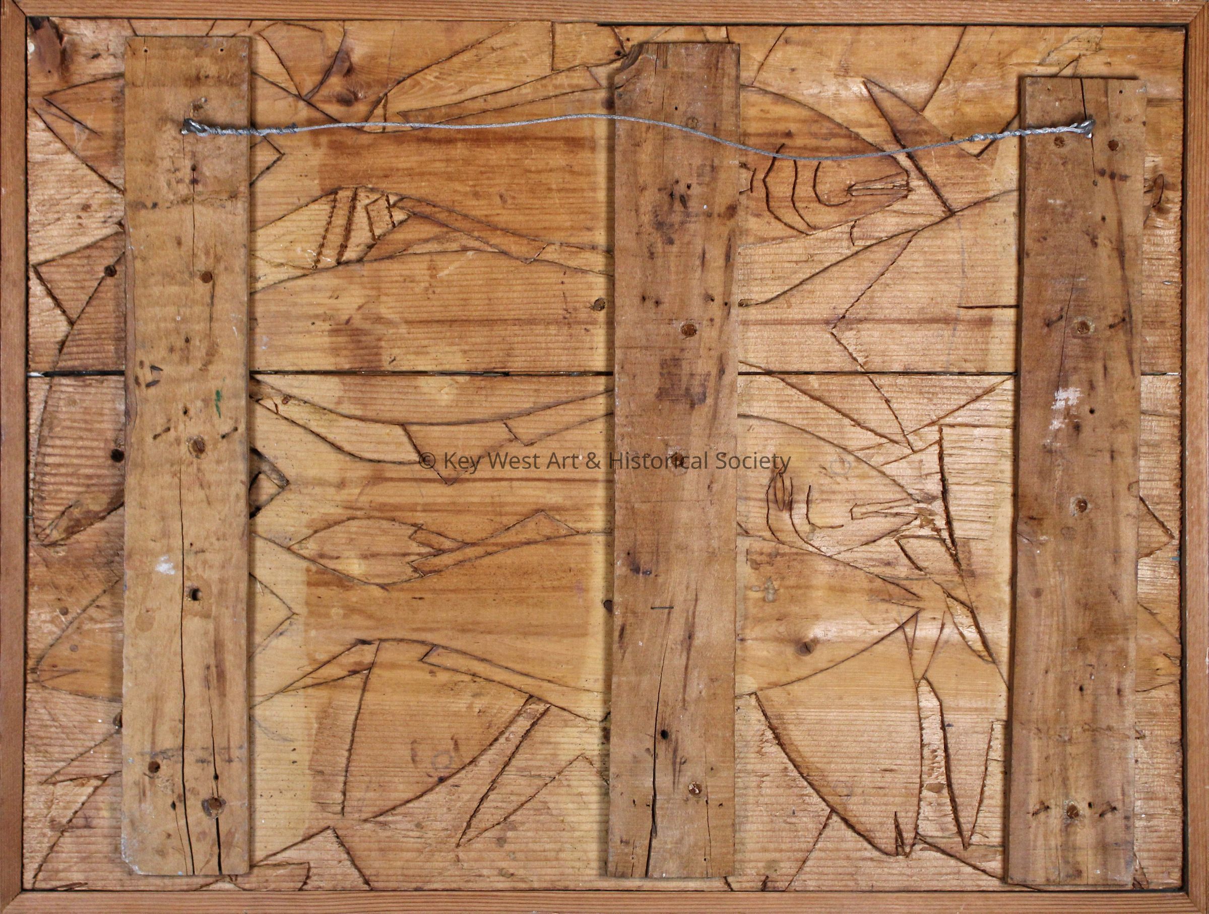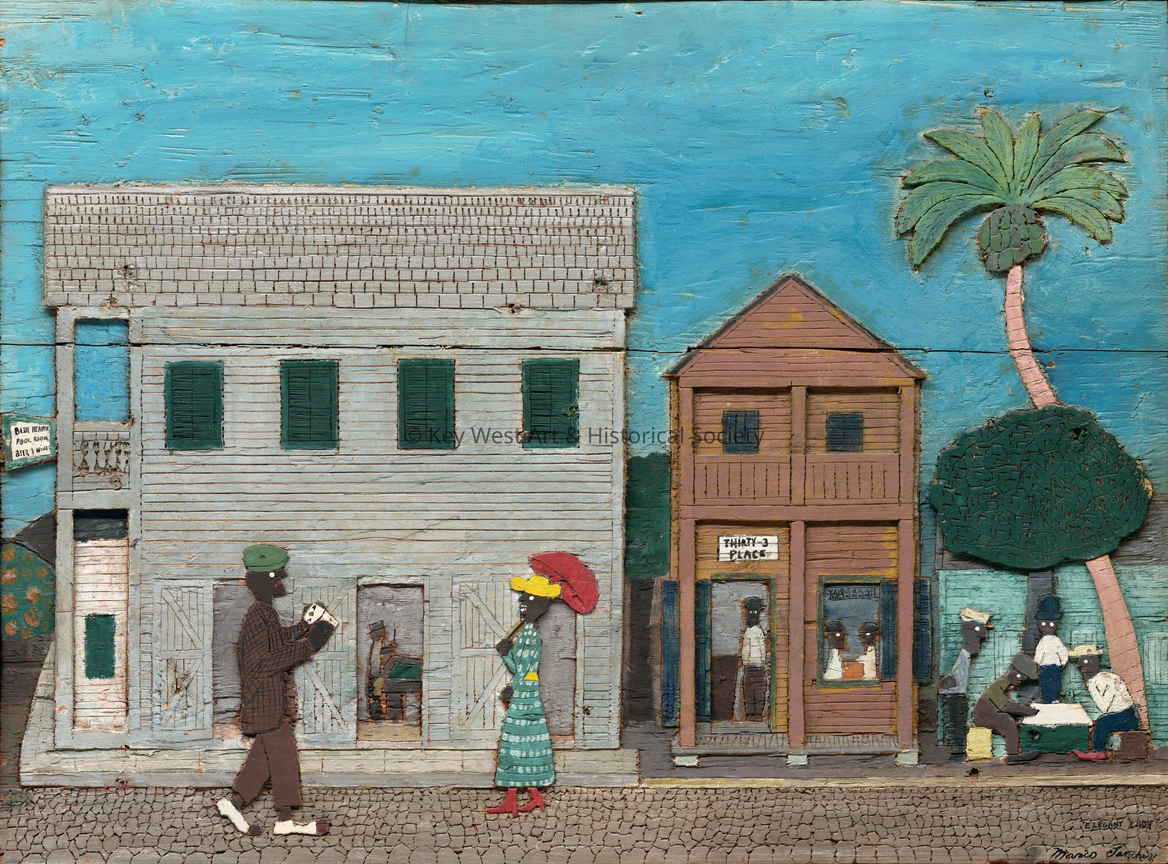 Woodcarving by Mario Sanchez depicting his classic folk-art style street scene at the corner of Petronia and Thomas streets in Bahama Village. The work features several buildings and people, all rendered in a naive, textured style. The central two-story building, Blue Heaven Pool Room, is painted white with green shutters and a green door. To its right, there is a smaller, brown wooden structure labeled 'Thirty 3 Place' outside of which a group of people is gathered by the entrance playing a game on a rustic table. To the left of the scene, a man in a green hat and brown suit, carrying playing cards, walks towards a woman in a vivid blue and white polka dot dress, holding a red parasol. The entire artwork is enclosed in a simple wooden frame.Type of Sculpture