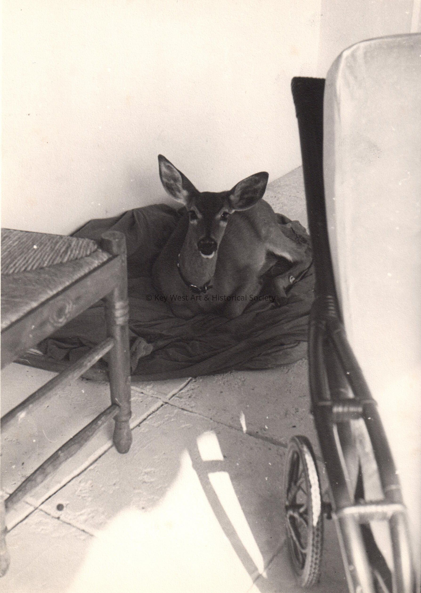 Black and white photograph of Elfina, the pet deer owned by Mitzpah Otto deBoer, laying on a dog bed.Photograph Details
