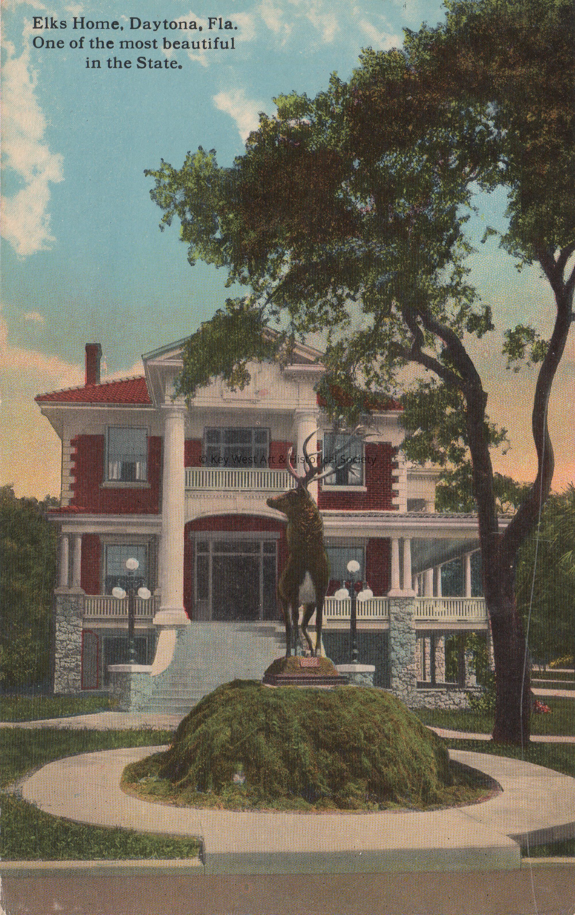 Postcard of an Elk statue and building. The caption reads, ‘Elks Home, Daytona, Florida. One of the most beautiful in the State.’Collection