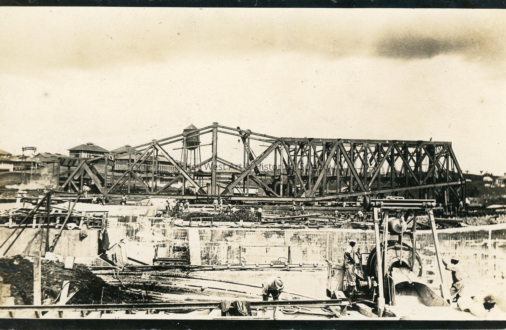 The emergency dam and water tower at Gatun looking east from center wall of upper lock. Concrete mixer in forground [sic] which is used by First Her. to open up access chambers after machinery is installedLanguage