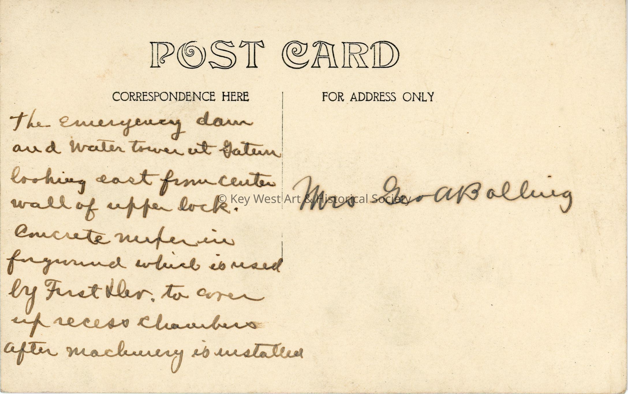 Black and white photograph postcard depicting the construction of the Panama Canal. The photo shows an emergency dam at the Gatun Locks that can be positioned and lowered to protect the lock gates. Behind the dam is a water tower. The postcard is addressed to Mrs. Geo. A. Balling.Subject
