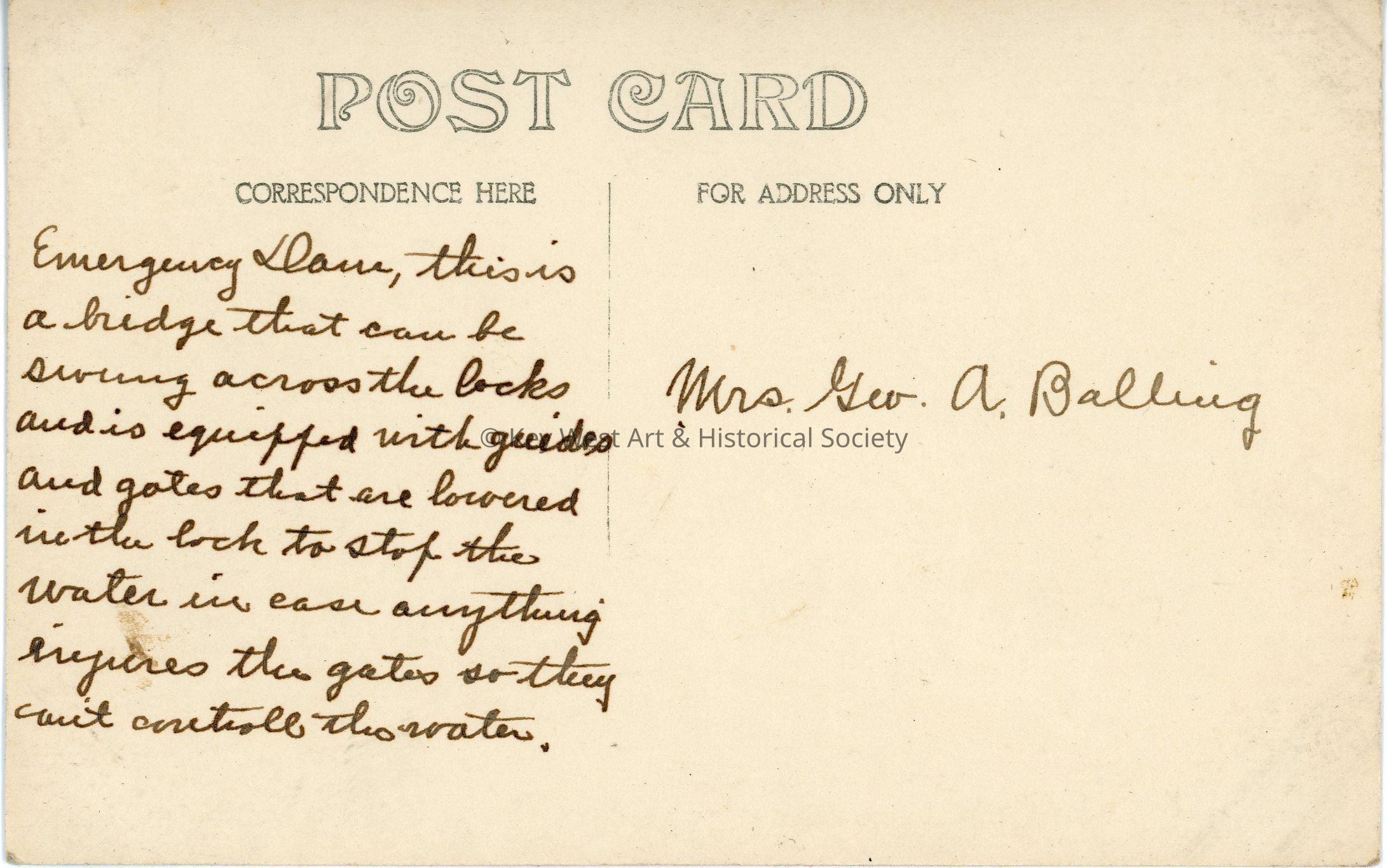 Black and white photograph postcard depicting the construction of the Panama Canal. The photo shows an emergency dam at Gatun Locks that can be positioned and lowered to protect the lock gates. The postcard is addressed to Mrs. Geo. A. Balling.Subject