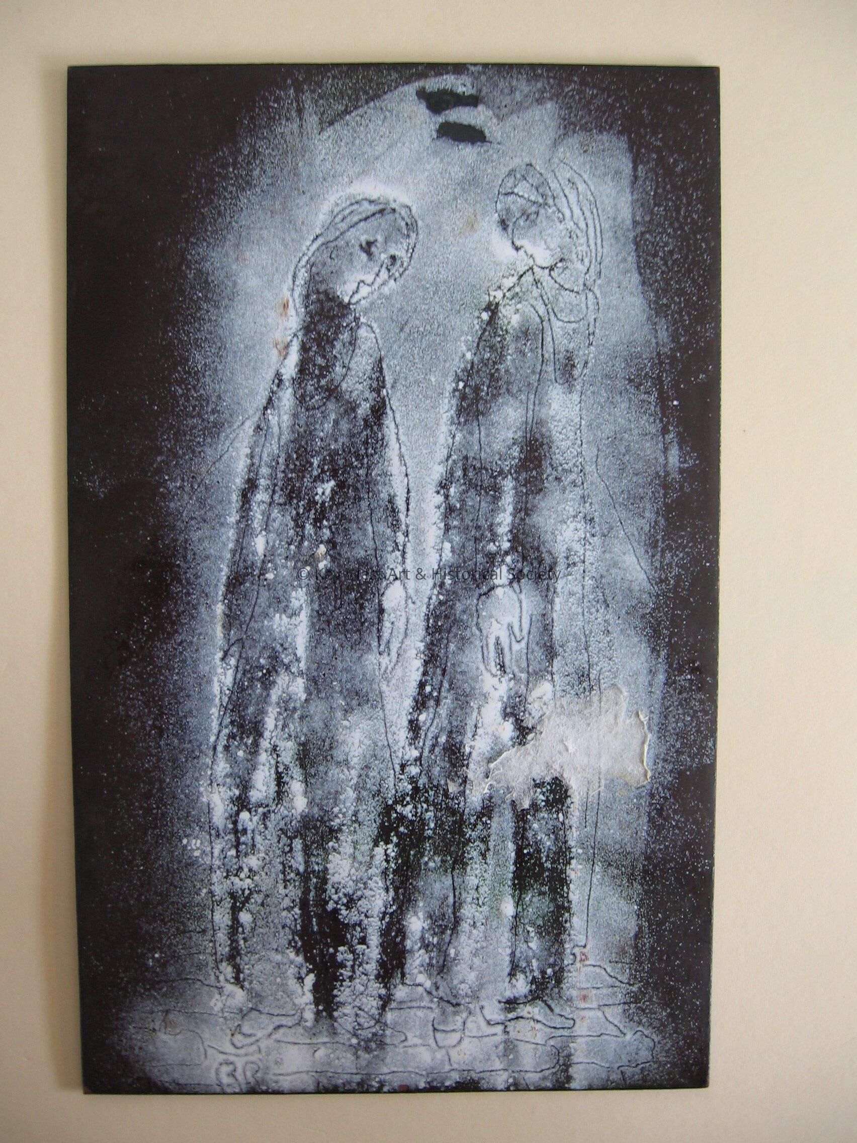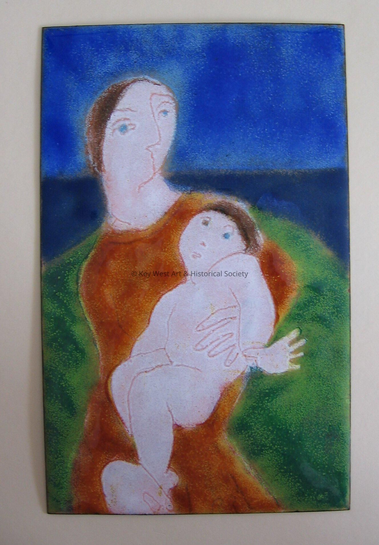 Enameled copper with image of a woman holding a child. On the other side is an image of two women in black and white. Comes with a bamboo stand.Collection